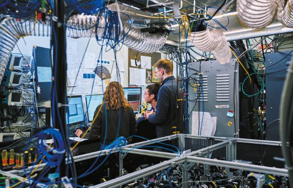 Komora próżniowa ma wiele ułożonych sekwencyjnie przedziałów o różnym przeznaczeniu. W pierwszym przedziale podgrzewamy pięciogramowy kawałek rubidu do temperatury ponad 100°C, co skutkuje emisją pary rubidowej. Para jest wdmuchiwana do następnego przedziału niczym woda tryskająca z węża. W drugim przedziale używamy pól magnetycznych i promieni laserowych po to, aby zmniejszyć prędkość pary. Spowolniona para przepływa następnie do kolejnego przedziału: pułapki magnetooptycznej, w której zostaje schwytana przez układ pól magnetycznych i wiązek laserowych. Kamery na podczerwień monitorują uwięzione atomy, które pojawiają się na naszym ekranie jako jasno świecące kule. W tym momencie atomy są zimniejsze niż ciekły hel. W kolejnym etapie przenosimy zimną chmurę atomów rubidu do ostatniej komory, wykonanej w całości z kwarcu. Tam oświetlamy chmurę zarówno światłem laserowym, jak i mikrofalami, co powoduje, że najcieplejsze atomy zostają odparowane. W efekcie rubid przechodzi ze stanu normalnego gazu do egzotycznej fazy materii zwanej kondensatem Bosego-Einsteina (Bose-Einstein Condensate; BEC). W stanie BEC prawa mechaniki kwantowej pozwalają atomom na delokalizację – rozprzestrzenianie się i nakładanie na siebie w taki sposób, że wszystkie atomy w kondensacie działają zgodnie. Temperatura atomów w kondensacie jest niższa niż 100 nanokelwinów, czyli miliard razy niższa niż temperatura ciekłego azotu.