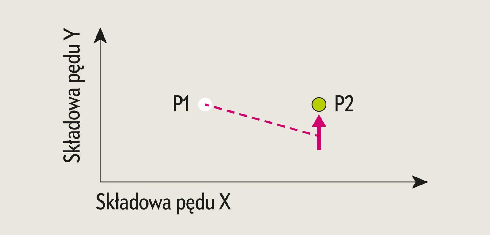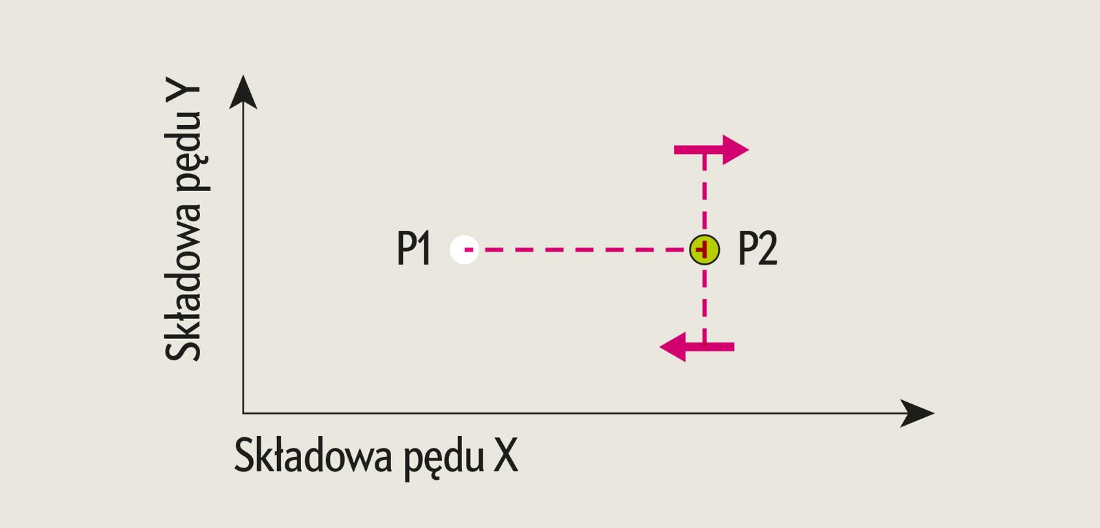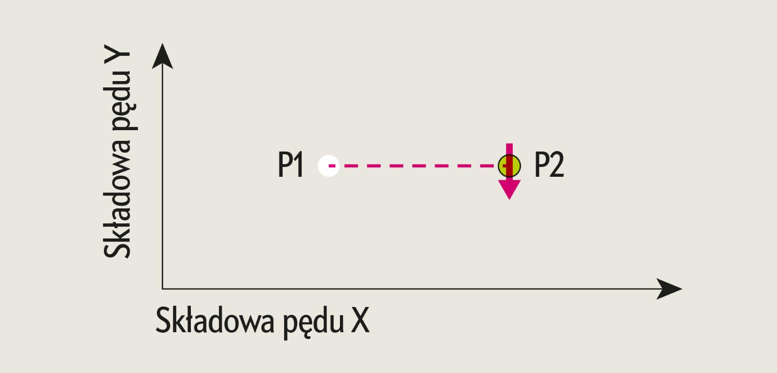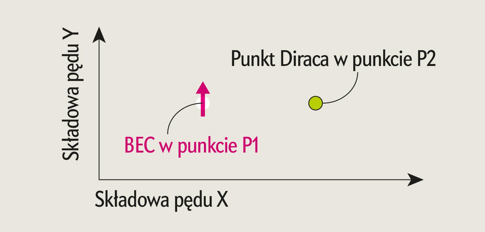 Teraz wyobraźmy sobie, że przesuwamy strzałkę z P1 bezpośrednio do P2 – czyli zmieniamy pęd BEC tak, aby był dokładnie równy wartości w punkcie Diraca: zobaczymy, że strzałka obróci się całkowicie „do góry nogami”. Zmiana ta oznacza, że stan kwantowy BEC przeskoczył ze stanu podstawowego do pierwszego stanu wzbudzonego.