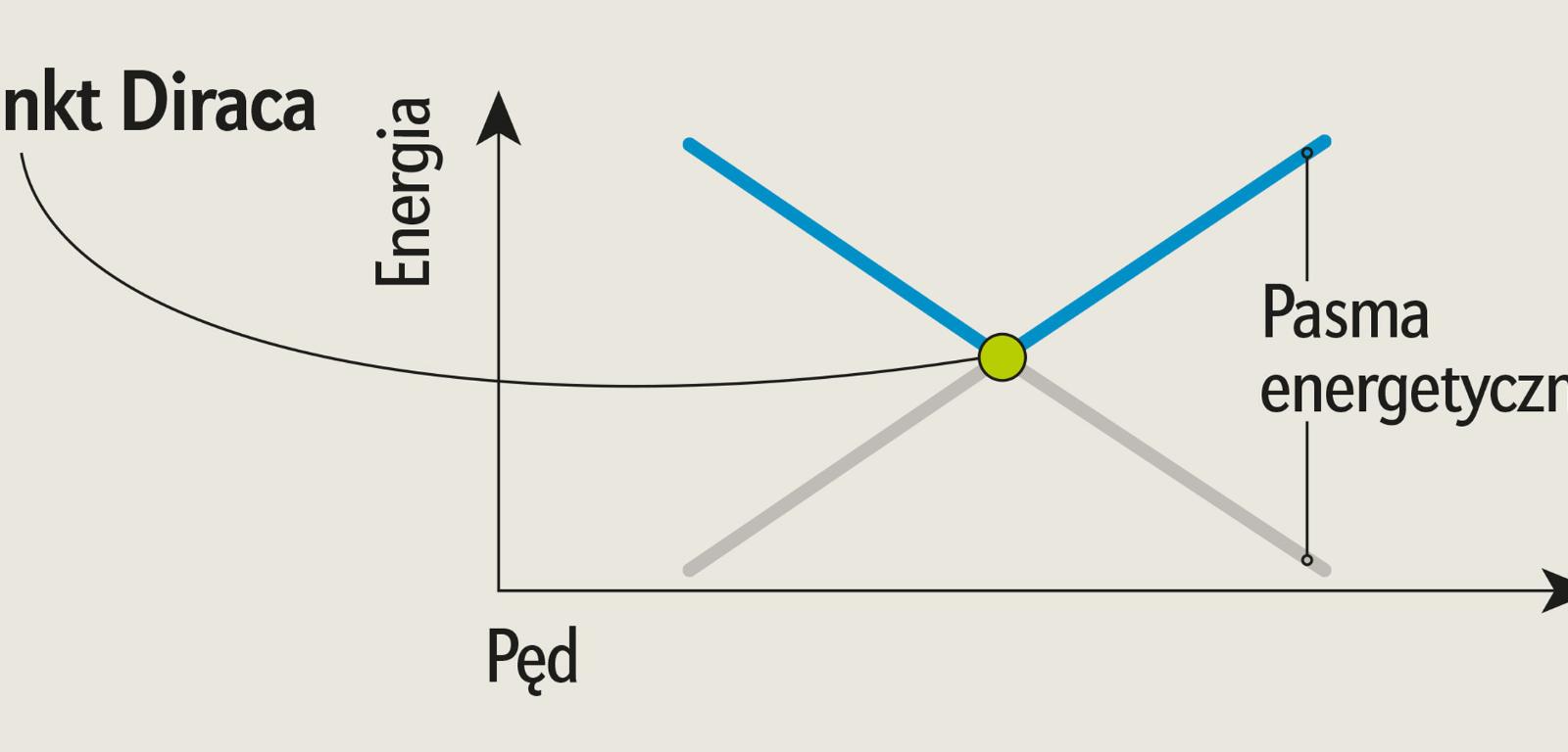 Przykładem dwuwymiarowego materiału topologicznego jest grafen. Dla mnie najbardziej intrygującą rzeczą w grafenie jest fakt, że w jego strukturze pasmowej występują specjalne miejsca znane jako punkty Diraca. W punktach tych dwa pasma energetyczne przyjmują tę samą wartość. Oznacza to, że elektrony mogą tam łatwo przeskakiwać z jednego pasma energetycznego do drugiego. Jednym ze sposobów na zrozumienie punktów Diraca jest zbadanie wykresu energii różnych pasm w funkcji pędu elektronu – właściwości związanej z energią kinetyczną cząstki. Takie wykresy pokazują, jak energia elektronu zmienia się wraz z jego ruchem, dając nam bezpośredni wgląd w interesującą nas fizykę. Na wykresach punkt Diraca wygląda jak miejsce, w którym stykają się dwa pasma energii; w tym punkcie są one równe, ale z dala od niego przerwa między pasmami liniowo rośnie. W grafenie punkty Diraca i związana z nimi topologia są powiązane z faktem, że może w nim występować pewien rodzaj kwantowego efektu Halla, który jest unikalny nawet wśród materiałów dwuwymiarowych – ułamkowy kwantowy efekt Halla – oraz szczególny rodzaj tunelowania.
