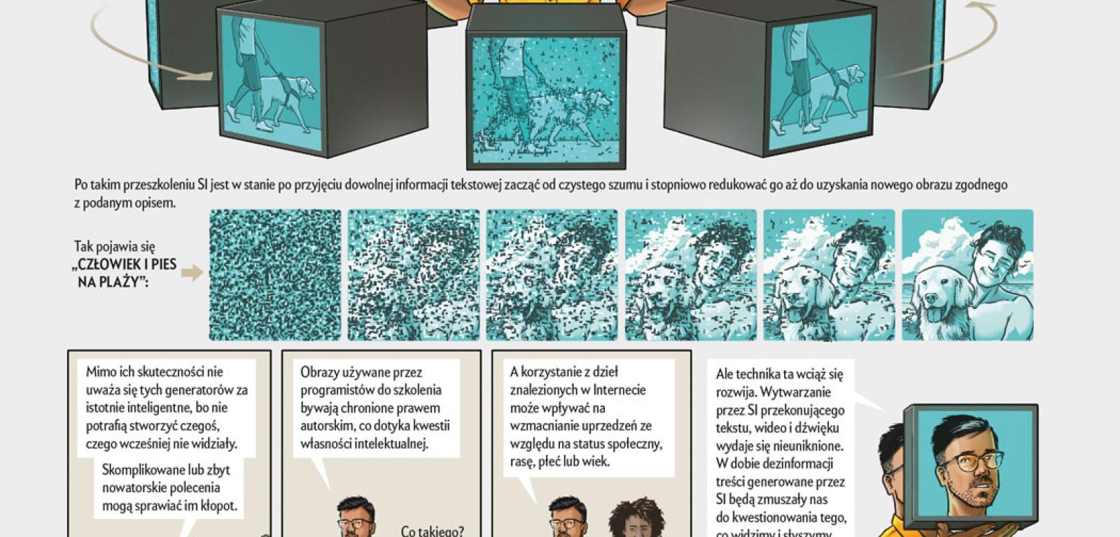 W zeszłym roku sztuczna inteligencja generująca obrazy pojawiła się po raz pierwszy w Internecie. Technika dawniej dostępna dla specjalistów stała się dostępna dla każdego, kto dysponuje łączem internetowym. Entuzjazm nie słabnie, a zdjęcia wygenerowane przez SI wygrały duży konkurs fotograficzny, ilustrowały czołówkę serialu telewizyjnego i zasugerowały wystąpienie papieża w modnym puchowym płaszczu. Jednak krytycy zauważyli, że nauczanie algorytmów na podstawie istniejących dzieł może naruszać prawa autorskie, a korzystanie z nich może szkodzić twórcom.