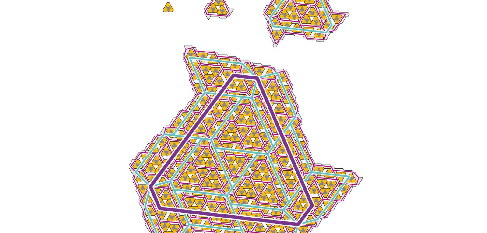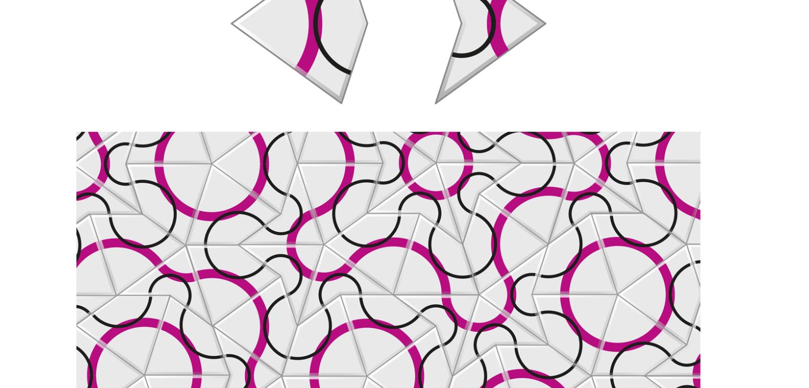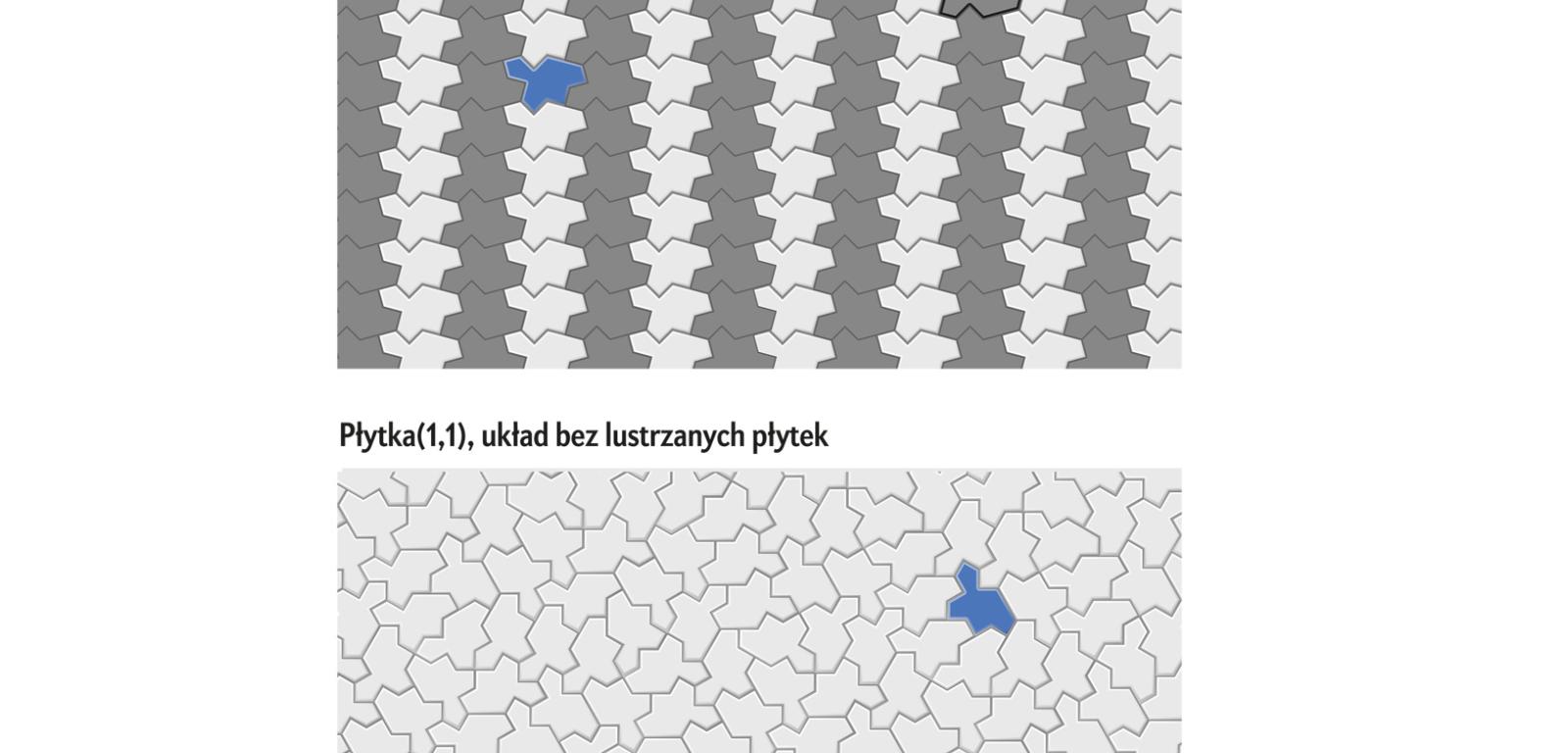 Na szczęście Smith postarał się o jeszcze jedną zdumiewającą niespodziankę. Tydzień po opublikowaniu naszego artykułu zaczął wysyłać do nas maile na temat Płytki(1,1), równobocznego elementu kontinuum kształtów, obejmującego kapelusz i żółwia. Wiedzieliśmy, że ten wielokąt nie jest aperiodyczny: dopuszcza okresowe układy łączące płytki lustrzane z nielustrzanymi. Jednak Smith zauważył, że po zakazaniu odwracania płytek, czyli po ograniczeniu się do jednostronnych, powstawały intrygujące klastry.