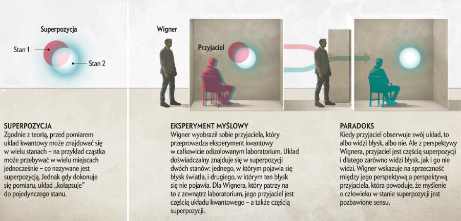 Ostatnie z tych pytań zostało wyeksponowane w 1961 roku przez węgierskiego fizyka Eugene’a Wignera, który wymyślił eksperyment myślowy z udziałem siebie i wyimaginowanego przyjaciela. Przyjaciel znajduje się w całkowicie odizolowanym laboratorium, prowadząc obserwacje układu kwantowego znajdującego się w superpozycji dwóch stanów: na przykład takiego, który wywołuje błysk światła, i takiego, który go nie wywołuje. Wigner jest na zewnątrz i obserwuje całe laboratorium. Jeśli nie ma interakcji między laboratorium a światem zewnętrznym, całe laboratorium ewoluuje zgodnie z zasadami fizyki kwantowej, a eksperyment przedstawia sprzeczność między obserwacjami Wignera a obserwacjami jego przyjaciela. Przyjaciel prawdopodobnie dostrzeże rzeczywisty wynik (błysk lub brak błysku), ale Wigner musi traktować przyjaciela i laboratorium jako znajdujące się w superpozycji stanów: jeden, w którym powstaje błysk i przyjaciel go widzi, a drugi, w którym nie ma błysku i przyjaciel nie widzi niczego. (Stan przyjaciela nie różni się od stanu kota Schrödingera, który w tym samym czasie jest zarówno martwy, jak i żywy).