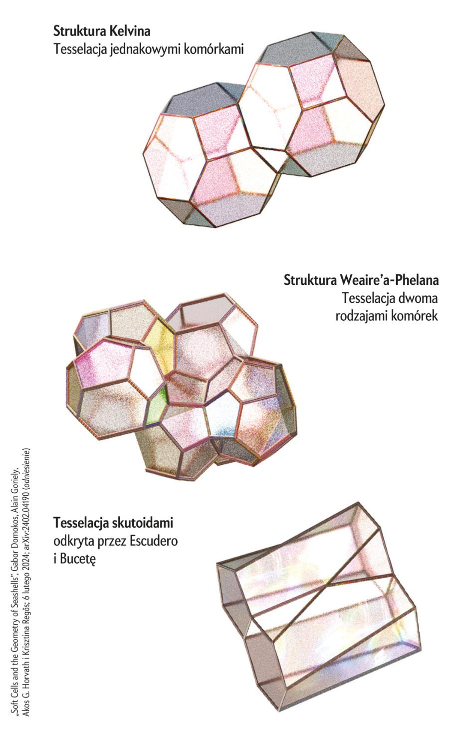 Pierwszym rozwiązaniem Kelvina była tesselacja z lekko odkształconych ściętych ośmiościanów. W artykule z 1994 roku fizycy Denis Weaire i Robert Phelan z Trinity College Dublin opisali ulepszoną strukturę Kelvina, będącą tesselacją z dwóch różnych wielościanów. Zaś w roku 2018 zespół biofizyków kierowany przez Luisa M. Escudero z University of Seville i Javiera Bucety z Institute for Integrative Systems Biology w Hiszpanii odkrył nowy kształt zwany skutoidem, przypominający zniekształconą komórkę plastra miodu. Skutoidy są komórkami tkanki nabłonkowej, dzięki którym tkanka ta może się wyginać. Mimo to wówczas nie padło pytanie o minimalną liczbę narożników bryły, której kopiami można wypełnić przestrzeń. „Pytając o to, nie mieliśmy początkowo pojęcia ani nawet przeczucia, że coś osiągniemy” – mówi Domokos.