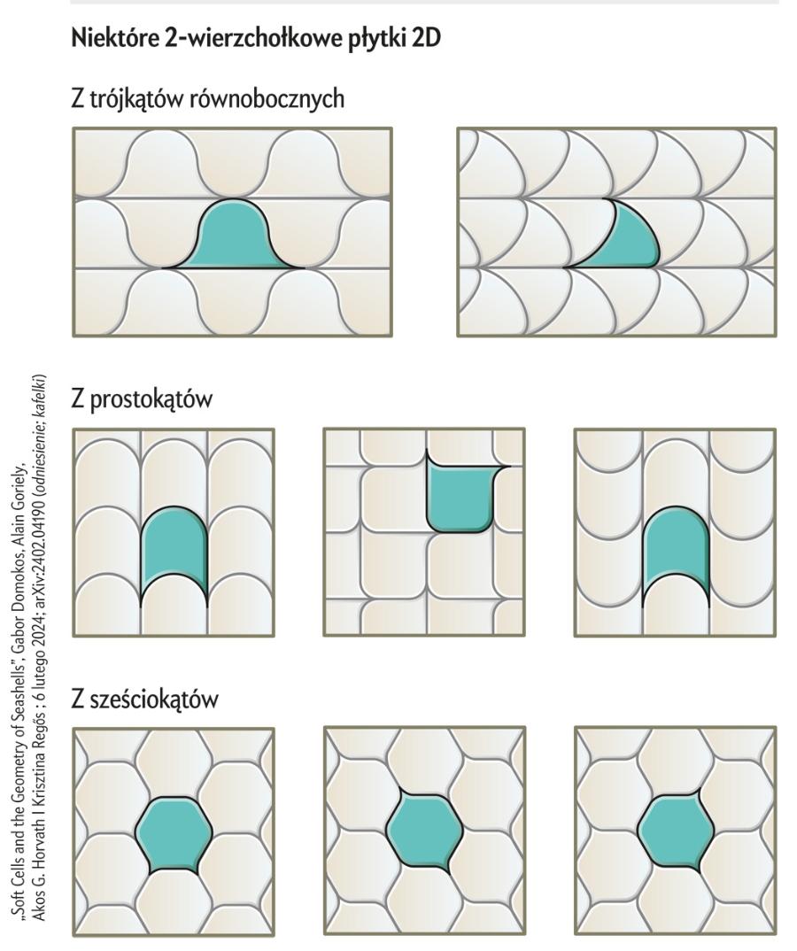 Gdy matematycy zaczęli rozumieć specyfikę miękkich komórek 2D, zaczęli też zdawać sobie sprawę, że kształty te istnieją poza szkicami i notatkami. „Były wokół nas” – mówi Domokos. Zespół zaczął dostrzegać wszędzie płaskie mozaiki dwuwierzchołkowych płytek – od tkanki mięśniowej po paski na zebrze. Spacerując po Budapeszcie, Regős dostrzegła je nawet w krzywiźnie skrzyżowań metalowej kraty bezpieczeństwa.