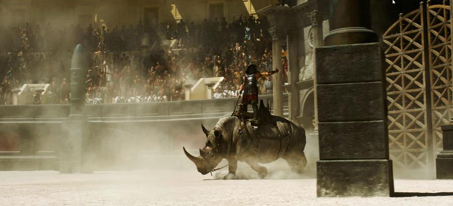 Reżyserowi udało się za to zrealizować marzenie, którego nie spełnił podczas tworzenia pierwszej części filmu – wprowadzenie na arenę nosorożca. Ten wielki ssak z rogiem rzeczywiście pojawiał się w widowiskach na rzymskich arenach, czego dowodzi m.in. relacja poety Marcjalisa z II połowy I w. n.e.: