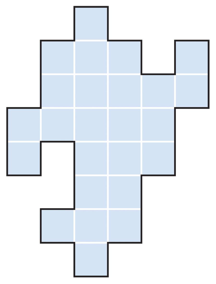 Podziel figurę na rysunku na trzy części (niekoniecznie wzdłuż białych linii lub tylko wzdłuż tych linii), z których będzie można złożyć kwadrat – tak, by części nie zachodziły na siebie i były szczelnie dopasowane. Części nie trzeba odwracać na drugą stronę, czyli wykluczamy ich lustrzane odbicia.