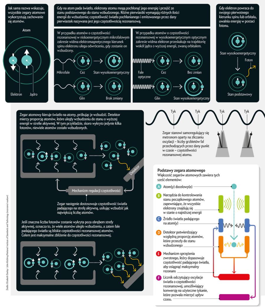 Od 1967 roku sekunda jest definiowana jako czas trwania 9 192 631 770 okresów dla częstotliwości rezonansowej cezu. Innymi słowy, gdy zewnętrzny elektron atomu cezu powraca do niższego stanu i emituje światło, 9 192 631 770 okresów jego fali świetlnej wyznacza jedną sekundę. „Można myśleć o atomie jak o wahadle – mówi John Kitching, badacz z NIST. – Sprawiamy, że atomy oscylują ze swoją naturalną częstotliwością rezonansową. Każdy atom cezu jest taki sam, a częstotliwość ta się nie zmienia. Wynika z fundamentalnych stałych. Właśnie dlatego zegary atomowe są obecnie najlepszym narzędziem do odmierzania czasu”.