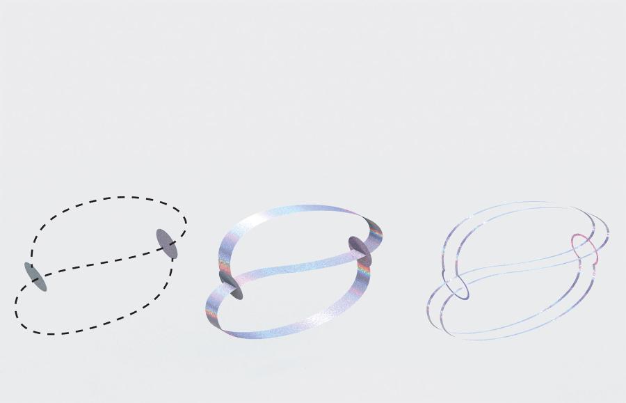 Za szczególnie atrakcyjny uważam trójwymiarowy analog obiektów 4D zwanych węzłami wstęgowymi. Sposób wykonania takich obiektów jest następujący: weź skończony zbiór dysków, natnij w nich szczeliny, a następnie dodaj paski między dyskami, przechodzące przez te szczeliny. Jeśli powstały obiekt będzie miał jeden brzeg, wówczas będzie to dysk wstęgowy, a węzeł 3D, ograniczający taki dysk, jest węzłem wstęgowym. W przestrzeni 4D, którą postrzegamy jako otaczającą przestrzeń 3D, jest wystarczająco dużo miejsca, aby cofnąć konstrukcję i odzyskać dysk (bez szczelin). Dlatego węzeł wstęgowy jest przykładem najprostszego typu węzła w 4D, a proces tworzenia dysku wstęgowego jest sposobem 3D jego konstrukcji. Hipoteza plasterka-wstążki, główny otwarty problem w topologii niskowymiarowej, mówi, że każdy taki prosty węzeł w 4D wywodzi się z dysku wstęgowego. Uważam ten kształt za fascynujący, ponieważ jest to prosta konstrukcja, która leży u podstaw trudnego – i niemożliwego do pełnego zwizualizowania – procesu w przestrzeni 4D. Ponieważ w przestrzeni 4D jest więcej miejsca niż w 3D, zbiór punktów w 4D, który sam w sobie stanowi dysk, może być zbyt skomplikowany, gdy oglądamy jego projekcję w 3D.