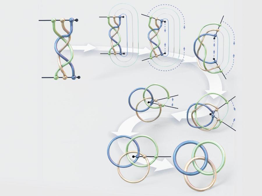 Pierścienie boromejskie można również postrzegać jako „zamknięty” warkocz. W tym kontekście stanowią one najprostszy nietrywialny przykład tzw. warkocza Brunna, który przestaje być zapleciony, gdy tylko jedno pasmo zostanie wyciągnięte. Jest trudne, ale możliwe, splatanie warkoczy o takiej własności z czterech lub więcej pasm, ale najbardziej znanym jest ten Brunna – standardowy warkocz, z którego wywodzą się pierścienie boromejskie. Moje badania koncentrują się na symetriach powierzchni, a warkocze Brunna mają tu istotne znaczenie – powstają w strukturach algebraicznych, które modelują ruch punktów na płaszczyźnie.