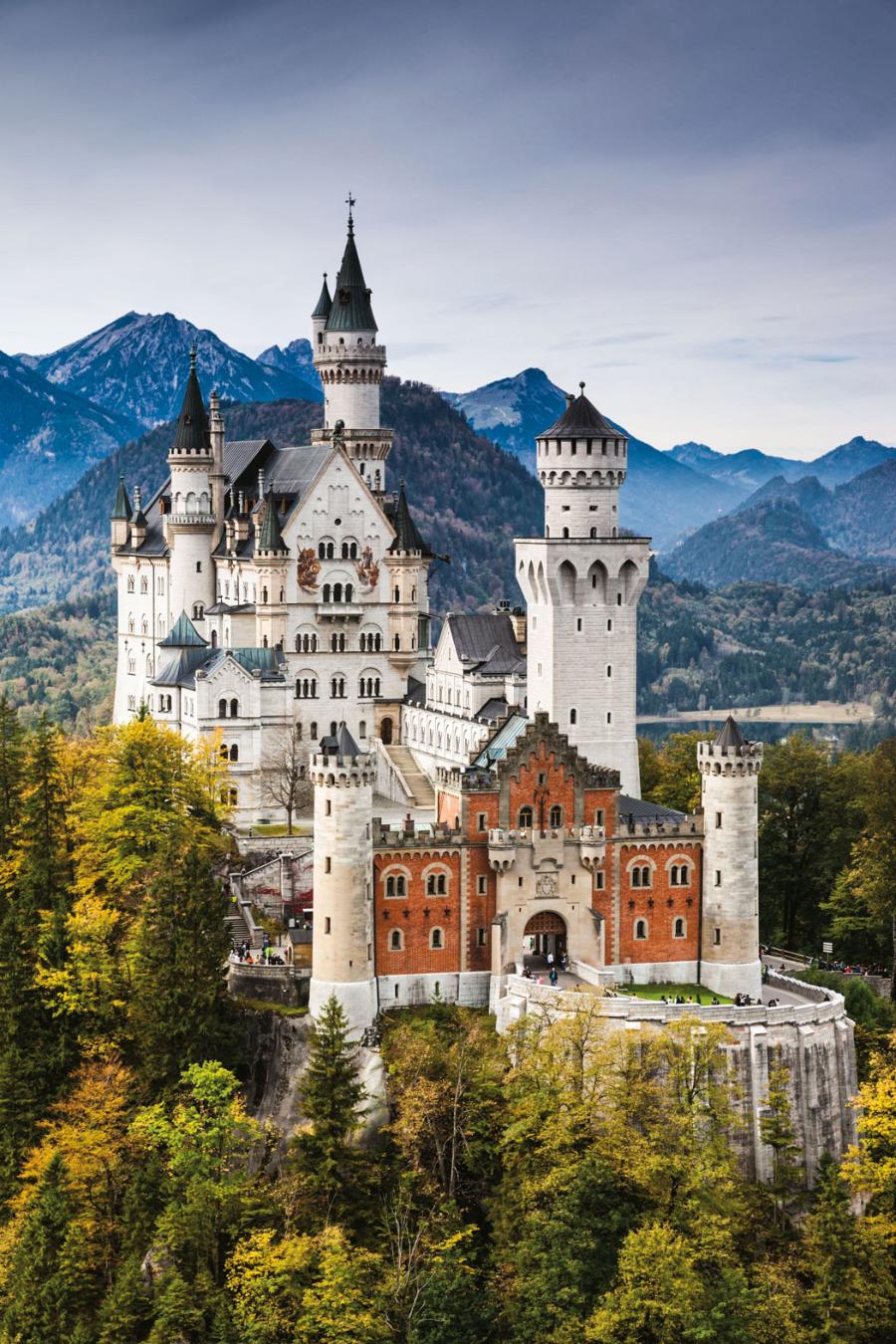 Podczas gdy Brytyjczycy spierali się, czy wolno „udawać historię”, za Alpami nikt nie miał takich skrupułów. W Bawarii romantyczne marzenie o średniowieczu przybrało kształt Neuschwanstein. Wznoszony od 1869 r. na surowym korzeniu z woli króla Ludwika II Bawarskiego zamek miał być scenografią dla królewskich snów, monumentalnym teatrem zainspirowanym operami Wagnera i legendami arturiańskimi. Architekci połączyli średniowieczne formy z nowoczesnymi żelbetowymi konstrukcjami i ukrytą infrastrukturą: centralnym ogrzewaniem, bieżącą wodą i windą kuchenną. Wieże i sale, w których nigdy nie gościł żaden rycerz, stały się uosobieniem wyobrażonego średniowiecza, a baśniowa sylweta stanowi dziś wzorzec dla kultury masowej– od bajek Disneya po gry komputerowe. Ironią losu jest, że Ludwik II mieszkał w zamku tylko kilka dni, bo tuż po przeprowadzce w 1886 r. utonął w jeziorze Starnberg.