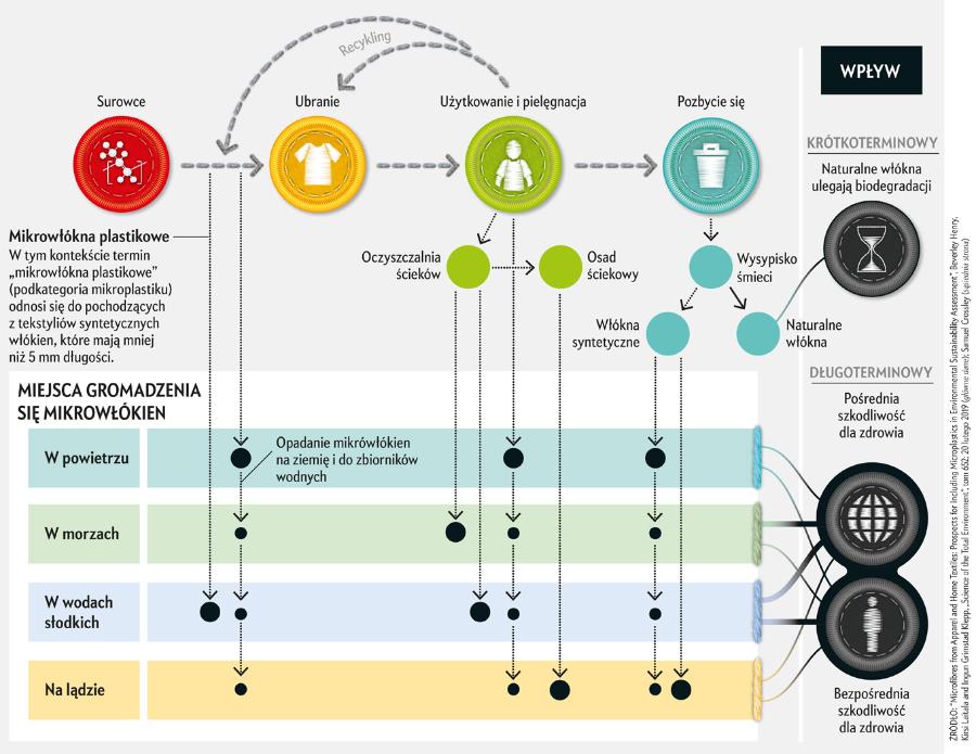 Włókna syntetyczne – takie jak poliester, nylon i akryl – są produkowane z tworzyw sztucznych pochodzących z ropy naftowej. Stanowią one około 60% światowej produkcji włókien. Są tanie i wszechstronne, ale jednocześnie znacząco przyczyniają się do zanieczyszczenia plastikiem. Jedno pranie odzieży z poliestru może uwalniać od 640 tys. do 1,5 mln mikrocząsteczek plastiku. Gdy takie ubrania trafiają na wysypisko, rozkładają się setki lat, emitując gazy cieplarniane (np. metan) oraz toksyczne substancje.