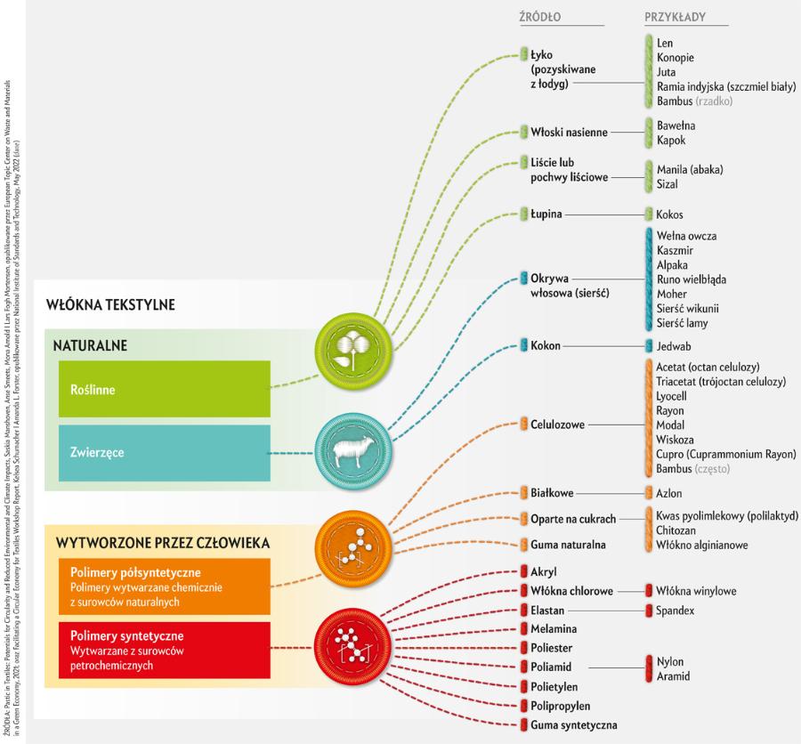 Zrównoważona moda nie musi oznaczać całkowitej rezygnacji z zakupów. Znajomość podstawowych informacji o różnych włóknach i ich właściwościach może pomóc w dokonywaniu lepszych wyborów – takich, które będą spełniały nasze oczekiwania, co z kolei sprawi, że będziemy je chętniej nosić, dbać o nie i zatrzymać na dłużej. W przemyśle tekstylnym stosuje się trzy główne typy włókien: naturalne włókna roślinne, jak bawełna i len; naturalne włókna zwierzęce, jak wełna; włókna syntetyczne i sztuczne, czyli odpowiednio tworzywa pochodzenia chemicznego – jak poliester, nylon oraz wiskoza, produkowana z masy drzewnej [patrz tabelka na s. 48].