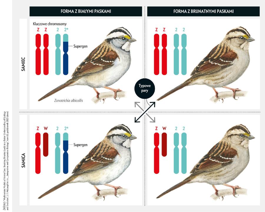 Od 25 lat badam ten fascynujące zwierzęta, starając się zrozumieć, w jaki sposób zachowanie społeczne i struktura genomów mogą wzajemnie wpływać na swoją ewolucję. Pasówki białogardłe stanowią szczególnie dobry model do tego rodzaju badań, ponieważ zarówno kategorie płci, jak i odmiany barwne powiązane są u nich ze specyficznymi chromosomami. Chromosomy płci, które u ptaków oznacza się literami Z i W, decydują o tym, czy pierwotne gonady rozwiną się w jajniki, czy w jądra. Ptaki mające zarówno chromosom Z, jak i W, zazwyczaj rozwijają jajnik, podczas gdy osobniki z dwiema kopiami chromosomu Z rozwijają jądra. Odmiana barwna z kolei wiąże się z innym chromosomem – chromosomem 2. Podobnie jak chromosomy płci, chromosom 2 u pasówki białogardłej występuje w dwóch wersjach. Jedna, standardowa, była pierwszą, którą zsekwencjonowali naukowcy. Druga to wersja przekształcona, zawierająca tzw. supergen – zestaw genów sprzężonych dziedziczonych lącznie. Niezależnie od płci, ptaki z kopią supergenu rozwijają się jako białopaskowe, a te z dwiema kopiami standardowego chromosomu – jako brunatnopaskowe.