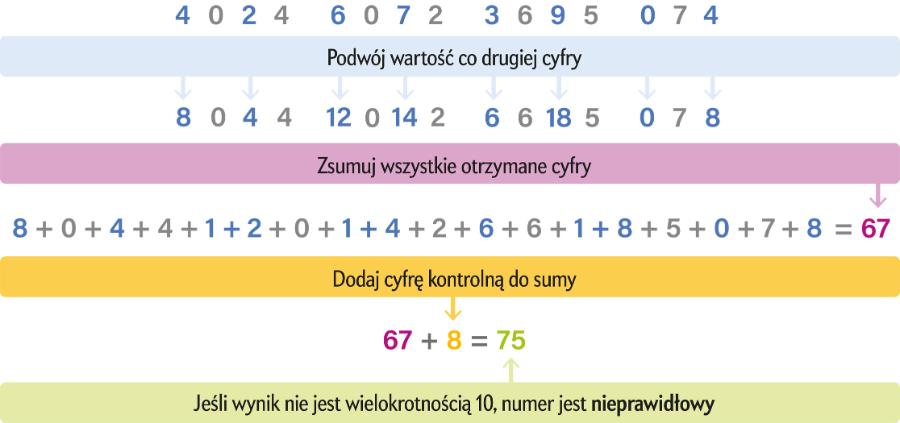 4. Do otrzymanej sumy dodaj kontrolną, czyli ostatnią cyfrę numeru karty. Jeśli wynik nie jest wielokrotnością 10, oznacza to, że podany numer karty jest nieprawidłowy.