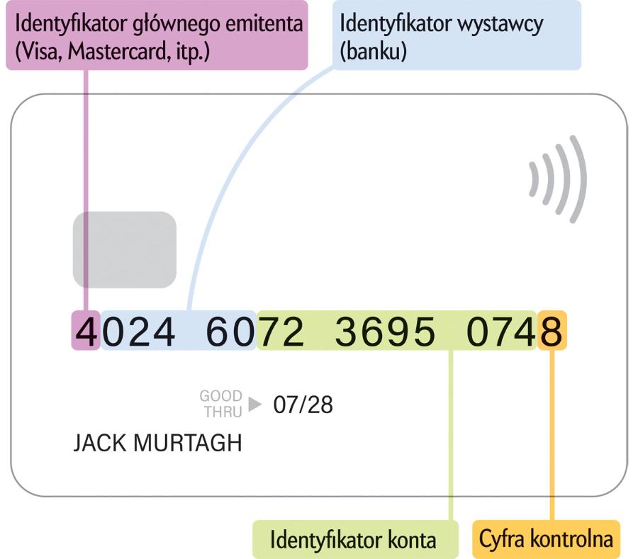 Pierwsza cyfra to identyfikator głównego emitenta (na kartach Visa jest to 4, na kartach Discover 6). Następne od pięciu do siedmiu cyfr oznacza bank lub instytucję, która wydała kartę. Dalsze cyfry (oprócz ostatniej) są numerem konta właściciela karty w danym banku. Ostatnia cyfra, zwana kontrolną, nie ma nic wspólnego z instytucjami finansowymi. Jest po to, aby cały numer karty został poddany testowi matematycznemu – algorytmowi Luhna. Oto schemat działania tego algorytmu: