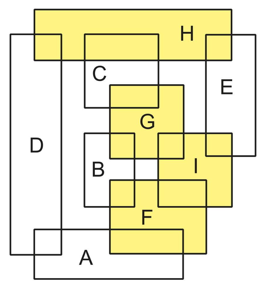 Każdy z 4 żółtych prostokątów przecina 3 inne, więc są to prostokąty F, G, H oraz I. H nie przecina F ani G, ani I, podczas gdy I przecina zarówno F, jak i G – stąd wniosek, że H jest najwyższym żółtym prostokątem, zaś I trzecim od góry. Dalej, wykorzystując relacje B\(F, G) i E\(H, I), można oznaczyć B i E, a potem już łatwo pozostałe prostokąty.