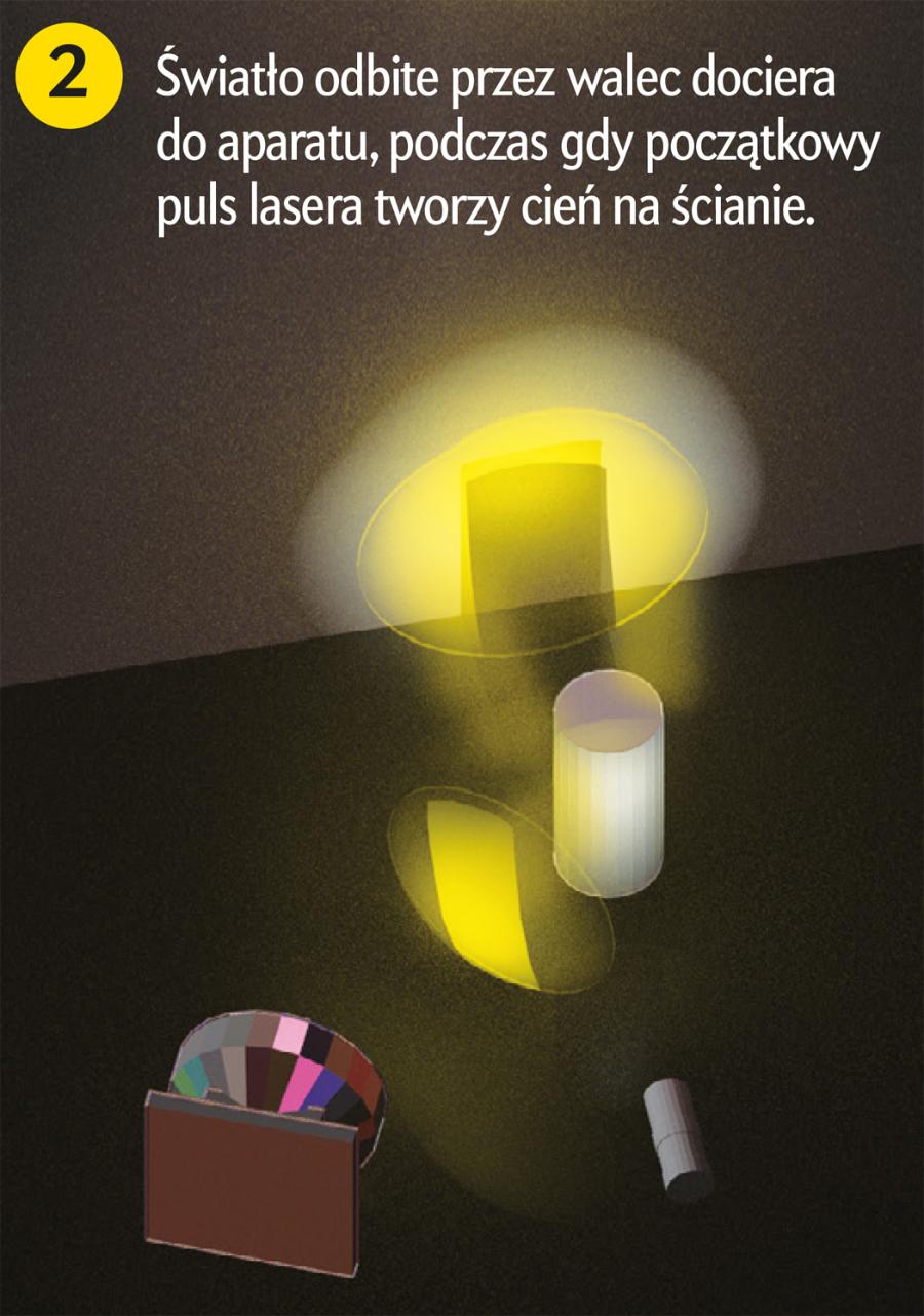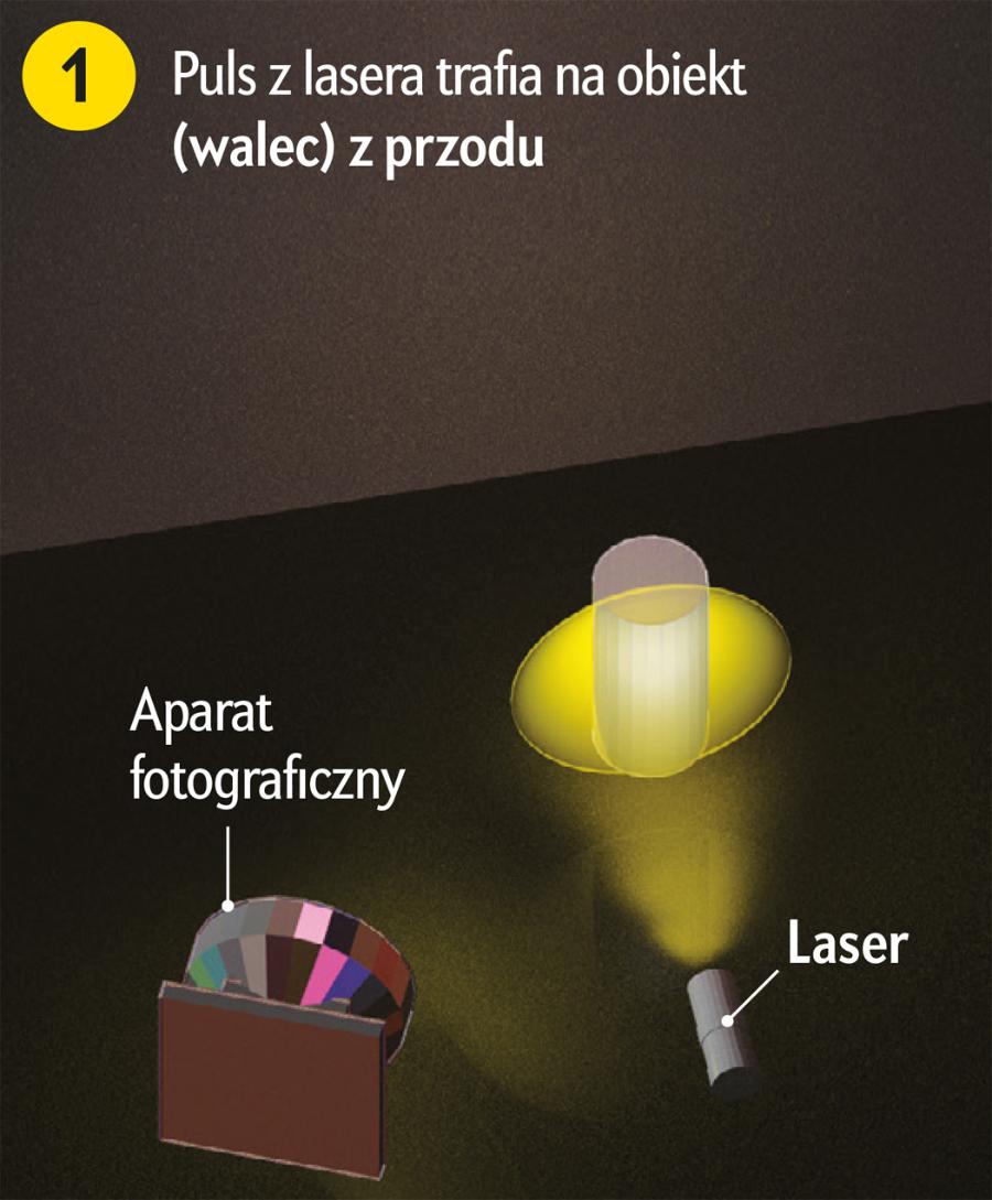 W naszym układzie eksperymentalnym wykorzystaliśmy kilka kluczowych nowoczesnych technik. Pierwszą z nich jest laser impulsowy, który emituje impulsy światła trwające zaledwie jedną pikosekundę, czyli 0,001 miliardowej części sekundy. Każdy impuls rozchodzi się na zewnątrz jak cienka, sferyczna powłoka światła. Światło to rozprasza się na obiekcie, który chcemy sfotografować, a odbite zbiera obiektyw ultraszybkiej kamery.