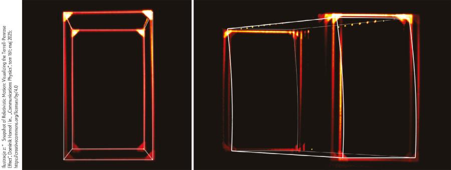 Z sześcianem było podobnie. W tym przypadku między każdym zdjęciem przesuwaliśmy obiekt o pięć centymetrów, naśladując prędkość 5 cm/200 ps, czyli około 80% prędkości światła. Ponownie, na naszym obrazie sześcian obrócił się, co doskonale zgadzało się z koncepcją Terrella i Penrose’a. Co ciekawe, pionowe krawędzie sześcianu również wydawały się zakrzywione jak hiperbole – zgodnie z przewidywaniami Ramesha Bhandariego z 1970 roku.