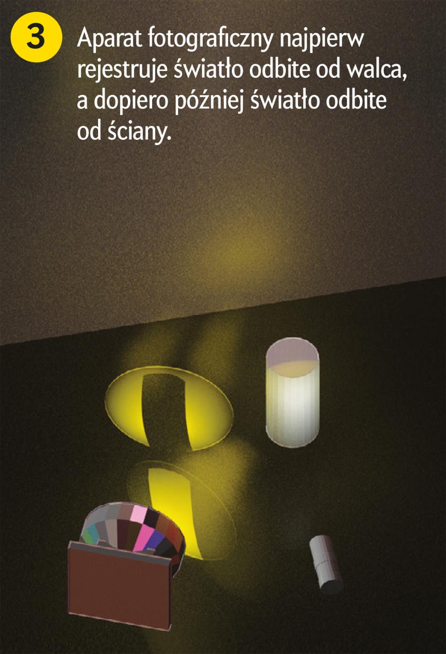 Pomiędzy kolejnymi rejestracjami obrazu ściśniętej kuli przesuwaliśmy ją o sześć centymetrów. W efekcie kula wydawała się poruszać z prędkością sześciu centymetrów na 200 ps, co stanowi 99,9% prędkości światła. Powtórzyliśmy ten proces 32 razy i złożyliśmy wszystkie obrazy w jeden kadr. Wynik? Kula, którą spłaszczyliśmy do koła, na zdjęciu wygląda na obróconą i kulistą, dokładnie tak, jak przewidzieli to Terrell i Penrose.