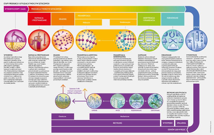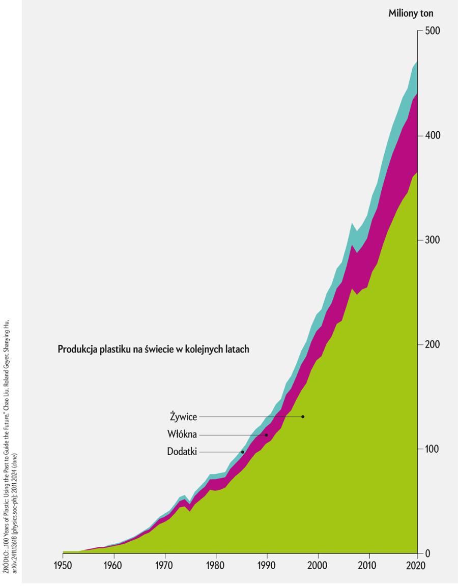Produkcja plastiku rośnie nieprzerwanie od zakończenia II wojny światowej, kiedy to firmy zaczęły inwestować ogromne środki w poszukiwanie i promowanie cywilnych zastosowań materiału, którego militarne wykorzystanie – od nylonowych spadochronów po polietylenową izolację dla zestawów radarowych – okazało się nieocenione. Konsumenci pozytywnie zareagowali na lawinę nowych produktów i jednorazowych opakowań, a roczna produkcja plastiku wzrosła z 2 mln t w 1950 roku do ponad 500 mln t obecnie. W przełomowym badaniu z 2015 roku po raz pierwszy oszacowano całkowitą ilość plastiku wyprodukowanego na świecie do tego momentu. Uzyskano wynik 8,3 mld t. Roland Geyer, ekolog z University of California w Santa Barbara i współautor tamtego badania, szacuje, że do dziś łączna ilość wytworzonego plastiku przekroczyła już 10 mld t. Zespół Geyera ustalił, że około trzy czwarte całego tego plastiku stało się odpadem: 9% zostało poddane recyklingowi, 12% spalono, a 79% trafiło na wysypiska lub do środowiska. Jeśli obecne tendencje się utrzymają, do 2050 roku produkcja tworzyw sztucznych osiągnie poziom 1,1 mld t rocznie, a – jak mówi obrazowo Geyer – łączna ilość wytworzonego plastiku wystarczyłaby do pokrycia powierzchni USA warstwą dosięgającą kostek.