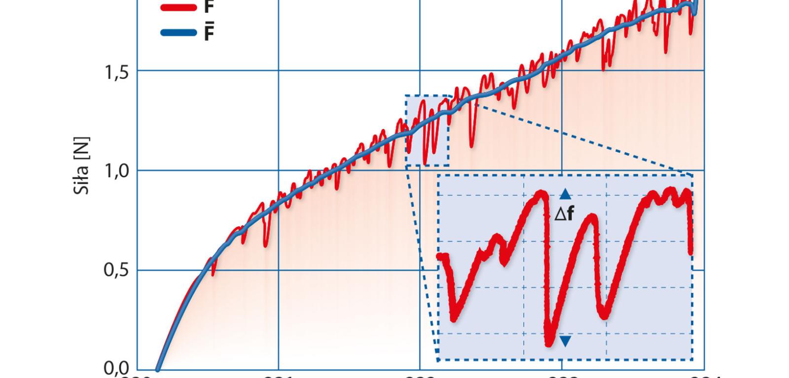 Na wykresie znajdowały się tzw. szumy, czyli niewielkie odchylenia od głównego trendu. Fluktuacje te miały bardzo specyficzny kształt: powolny liniowy wzrost przerywany gwałtownym spadkiem (patrz wykres). Odpowiedzialne za to jest tarcie między nylonowymi włóknami w punktach ich styku. Z lekcji fizyki wiemy, że gdy jedno ciało przesuwa się wzdłuż powierzchni drugiego, siły tarcia opierają się sile pchającej. Poniżej pewnej siły krytycznej dominuje tarcie i obiekty te nie poruszają się (powolny wzrost na wykresie); powyżej tej siły tarcie zostaje pokonane, a ciała zaczynają się nagle przesuwać względem siebie (gwałtowny spadek na wykresie). Badając bardziej szczegółowo ten fenomen, naukowiec zdał sobie sprawę, że włókna w punktach styku nie przesuwają się względem siebie punkt po punkcie, lecz w dużych grupach wzdłuż ściegów.