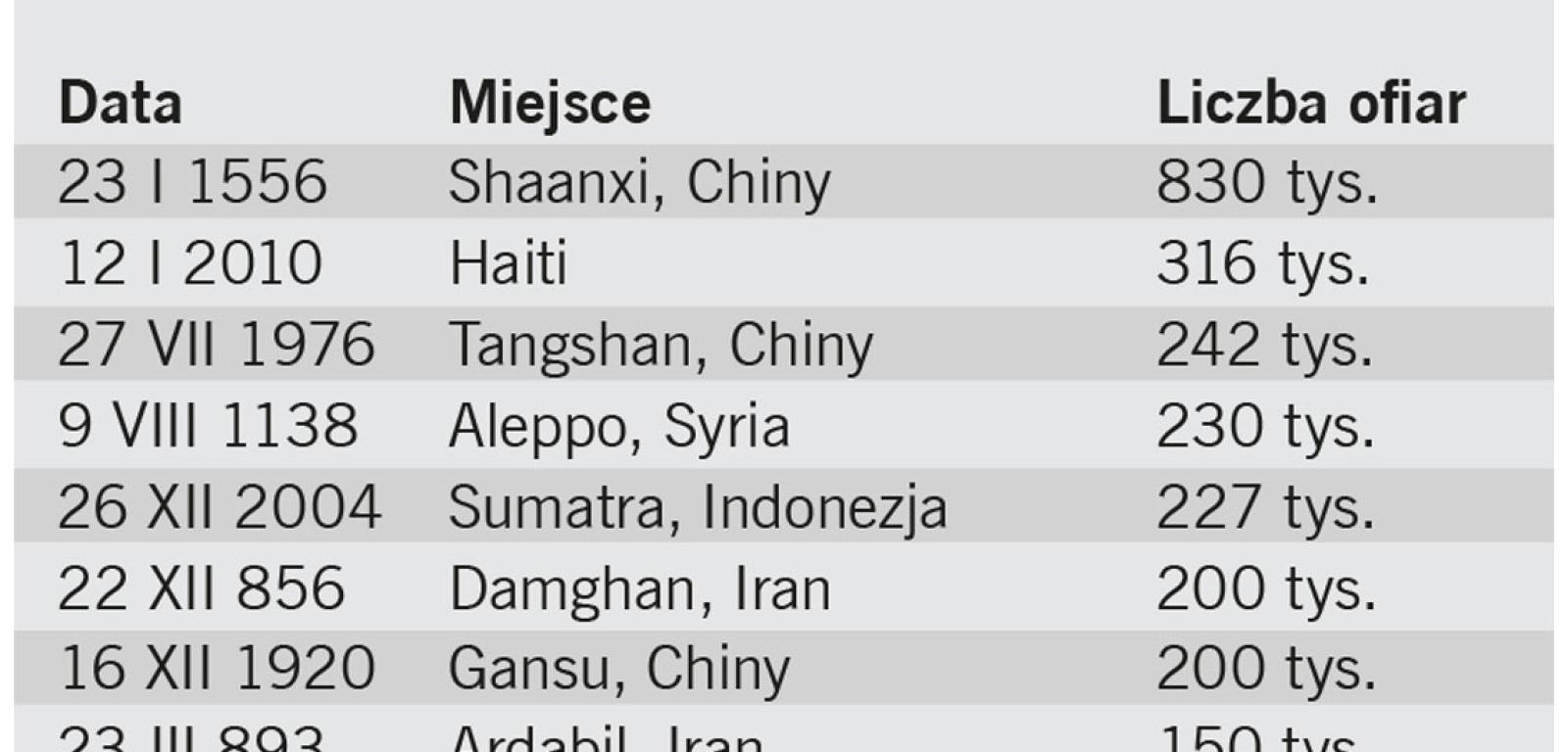 O ile powstające współcześnie wieżowce buduje się już z uwzględnieniem nowoczesnych rozwiązań antysejsmicznych, o tyle problemem nadal jest starsza zabudowa i cała infrastruktura dużych miast. Japońska zaradność ma swoje odzwierciedlenie w liczbach. Katastrofalne trzęsienie ziemi z 2011 r., kiedy ogromna fala tsunami uszkodziła elektrownię jądrową w Fukushimie, choć miało blisko 9 w skali Richtera, pochłonęło niespełna 16 tys. ofiar. Dla porównania o wiele słabsze wstrząsy z Haiti z 2010, nieprzekraczające 7 stopni w skali Richtera, kosztowały życie 316 tys. osób. Ta dysproporcja jest porażająca. Mimo że duże trzęsienia ziemi pojawiają się względnie rzadko, powodują katastrofalne skutki: Kaszmir 2005 r. – 86 tys. zabitych, Indonezja 2004 r. – 227 tys., Chiny 1976 r. – 242 tys. Podczas trzęsienia ziemi w maju 2008 r. w chińskiej prowincji Syczuan w dwie i pół minuty zawaliło się 80% budynków. Pod gruzami domów, sklepów i biur zginęło 70 tys. osób. Nie pogrzebały ich nowoczesne biurowce, lecz stare, nieprzystosowane do wstrząsów domostwa.