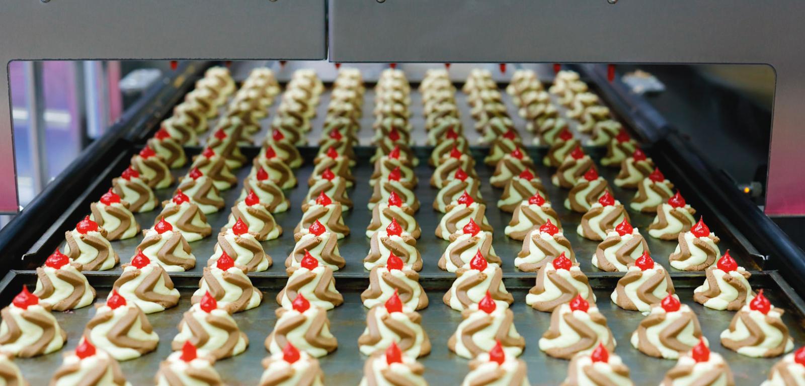 Podobnie wygląda przemysłowa produkcja cukiernicza. Na rynku oferowane są kompletne linie produkcyjne. Dozowanie i mieszanie odbywa się automatycznie. Odpowiednio uformowane ciastka trafiają następnie do pieca. Współczesne zakłady cukiernicze korzystają najczęściej z pieców tunelowych, w których ciastka są wypiekane na metalowym taśmociągu. Pozwala to na produkcję w systemie ciągłym. W przypadku ciastek z polewą czekoladową stosuje się specjalne oblewarki pokrywające wyroby ze wszystkich stron lub tylko z jednej oraz tunele chłodnicze, które umożliwiają szybkie zastygnięcie czekolady na ciastku.