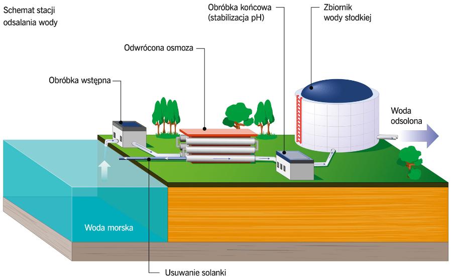 Dane statystyczne pokazują, że w 2015 r. na świecie działało niemal 20 tys. stacji odsalania wody, dostarczających dziennie prawie 100 mln m3 słodkiej wody dla ponad 300 mln ludzi. Obecnie największa taka stacja znajduje się w Ras Al-Khair (Arabia Saudyjska). Ten położony nad Zatoką Perską obiekt jest w stanie produkować 1 mln m3 wody na dobę. Wykorzystano tutaj technologię wielostopniowej destylacji rzutowej połączonej z odwróconą osmozą. Energii dostarcza zintegrowana z zakładem elektrownia. Cały zakład zapewnia 3,5 tys. miejsc pracy. Bardzo duża instalacja produkująca wodę pitną (stacja Sorek) znajduje się w Izraelu, 15 km od Tel Awiwu. Kosztowała olbrzymią kwotę – 500 mln dol. – ale dzięki temu może dostarczać dziennie 624 tys. m3 wody pitnej. Zasilana jest rurociągami, których wloty znajdują się 1,5 km od brzegu morza. Zastosowano tu klasyczny system odwróconej osmozy. Uzyskana woda jest następnie mineralizowana do odpowiedniego poziomu oraz dezynfekowana. Wszystkie instalacje odsalające pokrywają zapotrzebowanie Izraela na słodką wodę w 50%, a planowana jest już budowa kolejnych.