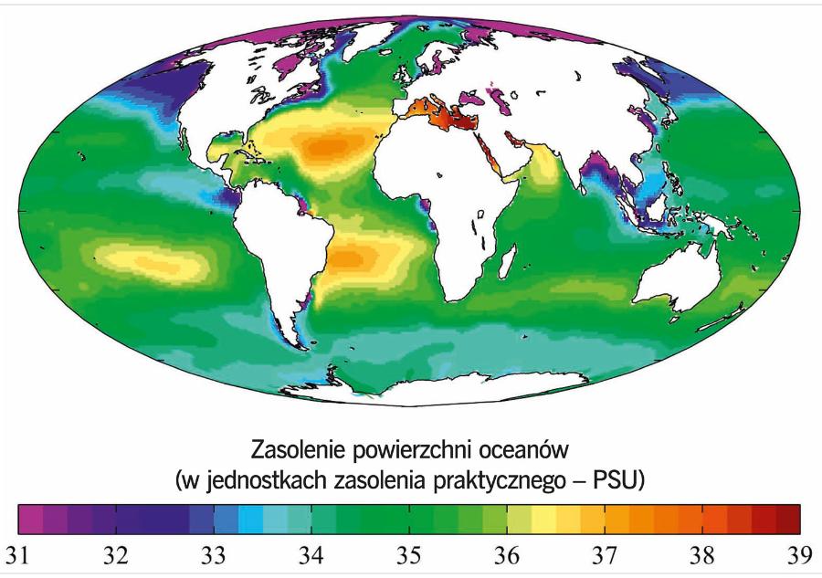 Woda słodka zawiera w litrze mniej niż 0,5 g soli (NaCl oraz innych), woda brachiczna (słonawa) – 0,5–30 g (Morze Czarne, Bałtyckie i Kaspijskie, sporo jezior, lejkowate ujścia rzek, w których działanie pływów powoduje stałe mieszanie się słodkiej wody rzecznej z morską), a słona (morska) – więcej niż 30 g. Średnie zasolenie mórz i oceanów wynosi 3,5% (35 g soli na litr), przy czym spotyka się miejsca o znacznie większym zasoleniu, jak Morze Martwe, gdzie mamy ponad 34% soli. Woda o zawartości soli powyżej 50 g/l nosi nazwę solanki. Wody słodkie zawierają głównie węglany (wapnia i magnezu), podczas gdy w wodach morskich i oceanicznych występują przede wszystkim chlorki i siarczany (sodu, magnezu, wapnia i potasu).