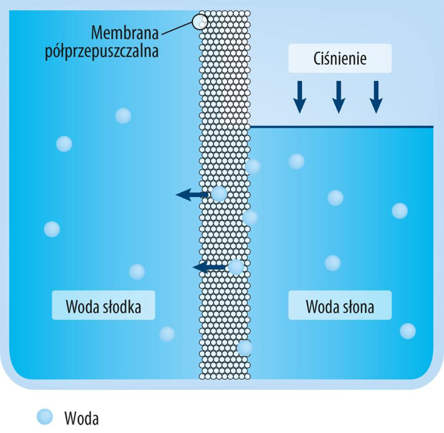 Bardzo popularną i szeroko stosowaną na świecie metodą odsalania wody jest tzw. odwrócona osmoza. Warto wyjaśnić najpierw, na czym polega naturalny proces znany pod nazwą osmozy spontanicznej. Jeśli dwie porcje cieczy oddzielone są błoną półprzepuszczalną, następuje przenikanie wody do tego miejsca, w którym znajduje się więcej jonów czy też innej substancji rozpuszczonej. Można jednak wymusić proces odwrotny, czyli przenikanie wody w drugą stronę. W tym celu trzeba w zamkniętej przestrzeni przyłożyć ciśnienie, które będzie większe od naturalnego ciśnienia osmotycznego. Odwrócona osmoza wymaga więc stosowania wydajnych pomp wytwarzających ciśnienie, a co za tym idzie – sporej ilości energii. Filtry oparte na tym zjawisku zużywają też duże ilości wody surowej – w małych instalacjach domowych uzysk wynosi 5–15%, a w systemach przemysłowych – nawet 75%, ale wtedy zużycie energii jest zdecydowanie większe.