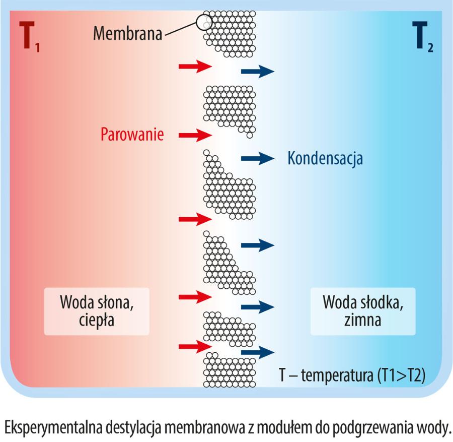 Można także zmodyfikować opisaną już wcześniej destylację, wbudowując w układ specjalną membranę – taki proces nazywamy destylacją membranową. Konstrukcje oparte na tej idei – w połączeniu z panelem przetwarzającym energię słoneczną w prąd – są aktualnie testowane w wielu miejscach na świecie (m.in. na Kanarach). Pozwalają one na uzyskanie 150–3000 l słodkiej wody dziennie – bez konieczności zasilania zewnętrznymi źródłami energii.