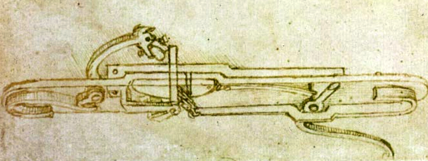 Przyjrzyjmy się pierwszej stronicy kompilacji rękopisów Leonarda zatytułowanej Kodeks Atlantycki, przechowywanej w Mediolanie. Przedstawia ona szkice różnych rodzajów łańcuszków i sprężyn stosowanych w zamkach kołowych. Wszyscy badacze twórczości Leonarda są zgodni, że z rysunków tych wynika, iż urządzenie to było mu znane. Na stronie tej znajdują się również szkice dłut o ostrzach w kształcie litery V używanych do obróbki drewna. Widocznie Leonardo próbował przystosować je do skrawania metalu.