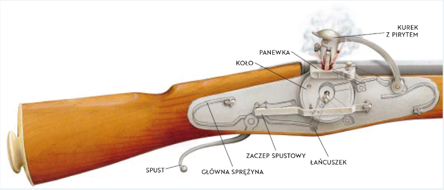 Zalety takiego schematu okazały się jednakże oczywiste, kiedy po przebadaniu pewnej liczby podobnych kół stwierdziłem, iż powstałe ząbki rzeczywiście przypominają te, które znajdują się na tarczowej lub obrotowej pile do cięcia metali. Takie koło może rzeczywiście wyciąć szczelinę w dnie metalowej panewki, zawierającej prochową podsypkę, zapewniając dokładne dopasowanie. Wyjątkowo duża szczelność była tutaj konieczna, gdyż do podsypywania na panewkę używano prochu bardzo drobnoziarnistego, miałkiego; jeśli więc rusznicą potrząsano (np. podczas jazdy konno), proch mógł się z niej wysypać przez niewielką nawet szczelin ę między kołem a panewką.