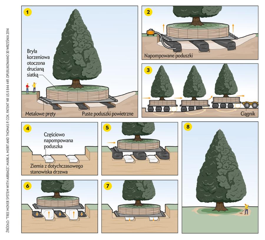 W połowie roku (2017) mieszkańcy Boise w Idaho z niepokojem śledzili, jak w drogę wyrusza najstarszy i najwyższy obywatel ich miasta. Licząca 105 lat sekwoja jest uznawana za lokalny symbol nie tylko ze względu na swoją długowieczność, ale także pochodzenie: ofiarodawcą sadzonki był John Muir, przyrodnik i współzałożyciel Sierra Club, amerykańskiej organizacji zajmującej się ochroną przyrody. Dlatego kiedy okazało się, że 10-piętrowy iglak uniemożliwia rozbudowę szpitala Saint Luke’s Health System, dyrekcja zwróciła się o pomoc do teksańskiej firmy Environmental Design, która opracowała i opatentowała technikę transportowania drzew. Jednak ważąca około 400 t sekwoja z Boise okazała się największym dotąd wyzwaniem. „Problem długo nie dawał mi spać – przyznaje David Cox, zastępca dyrektora zachodniego oddziału Environmental Design – i to zanim jeszcze szpital poinformował mnie o szczególnym pochodzeniu drzewa.” Zanim rozpoczęła się operacja, zespół zbadał system korzeniowy i wykopał wokół pnia rów o głębokości 1,5 m i średnicy 12 m w celu ochrony głównych korzeni. Po otoczeniu bryły korzeniowej drzewa metalową siatką pozwolono sekwoi przez siedem miesięcy przyzwyczajać się do nowej sytuacji. Kolejne ilustracje pokazują, jak przebiegała operacja przeniesienia.