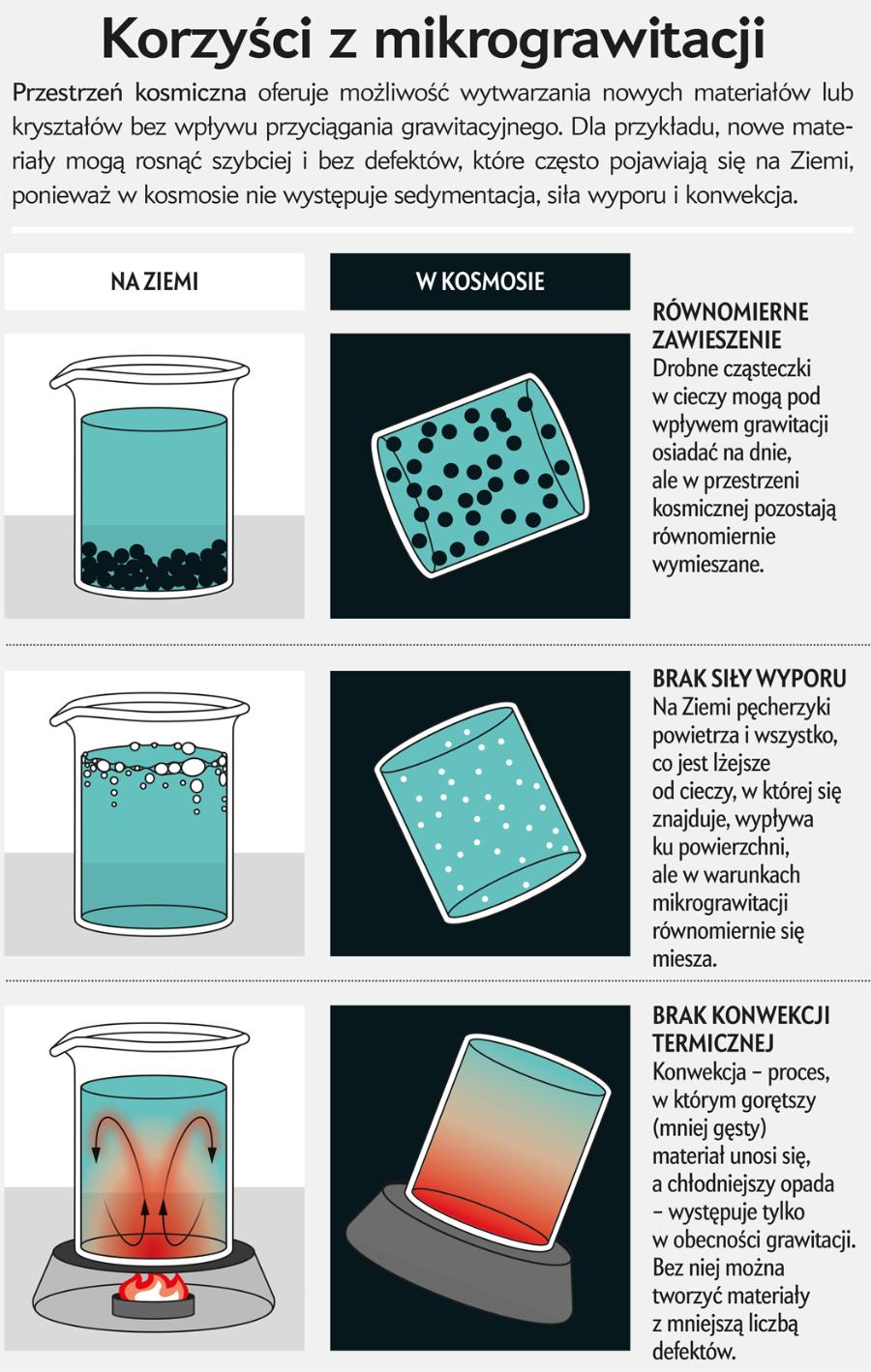Na Ziemi grawitacja ma ograniczający wpływ na procesy fizyczne, z których korzystamy przy produkcji półprzewodników i innych materiałów. Tworzenie produktów w warunkach braku grawitacji oferuje pewnego rodzaju wolność. Aby zrozumieć różnicę, rozważmy znajdującą się na Ziemi filiżankę kawy po turecku. Klarowny napój można pić po tym, jak grawitacja ściągnie drobne fusy z kawy na dno filiżanki. Jednak w warunkach mikrograwitacji panujących w przestrzeni kosmicznej fusy z kawy unosiłyby się równomiernie w całej filiżance, a astronauta biorący łyk miałby usta pełne drobin. Jest to oczywiście stan mało komfortowy w przypadku picia kawy, ale korzystny dla innych celów. Gdy substancje są równomiernie zawieszone w cieczy, tak jak ma to miejsce w przestrzeni kosmicznej, można tworzyć materiały o bardziej jednolitych właściwościach i robić to szybciej.