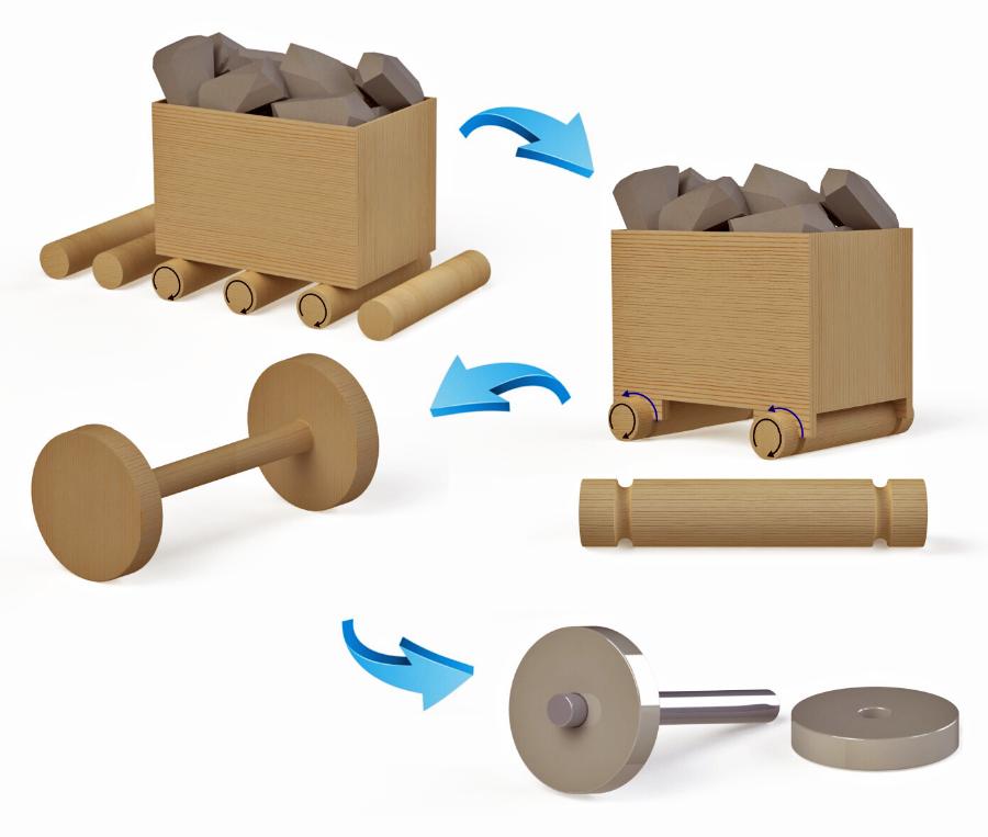 Z modeli obliczeniowych wynika, że górnicy najpierw wykorzystywali drewniane kłody jako rolki, po których przesuwali wózki z urobkiem. Później, aby zapobiec przesuwaniu się ładunku, zaczęli robić w kłodach nacięcia. I to ostatecznie doprowadziło do powstania układu kół i osi, czyli czegoś w rodzaju prymitywnego „zestawu kołowego”. Technologia ewoluowała ok. 500 lat – był to czas prób i błędów, dodawania do osi różnych funkcji, aż w końcu osiągnięto formę „niezależnego” koła.