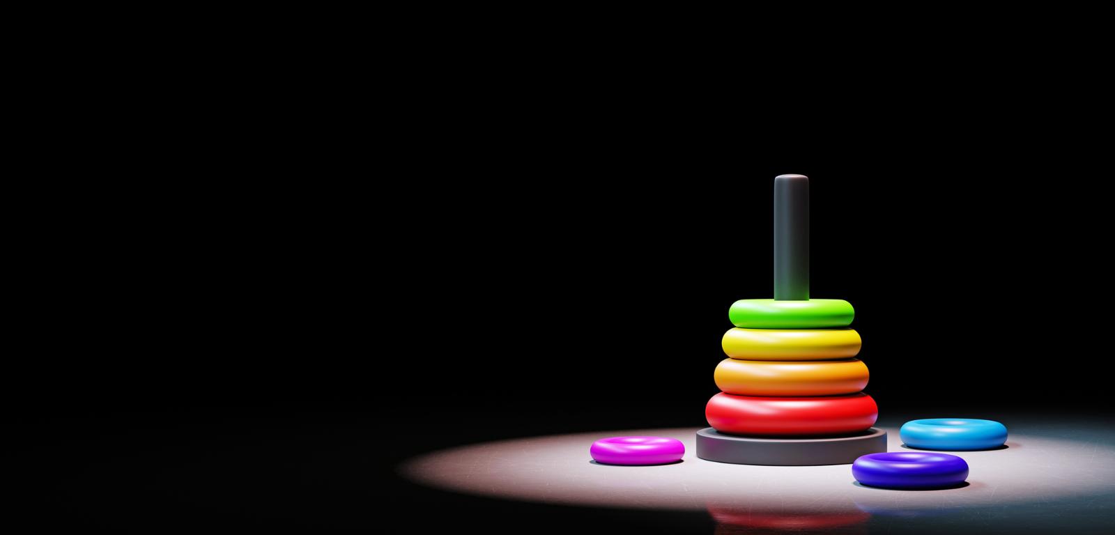 - „Wieża z Hanoi”. Zadaniem jest tu przeniesienie stosu krążków o różnych rozmiarach z jednego słupka na inny (jest także trzeci – pomocniczy), ale większego nie można położyć na mniejszym.