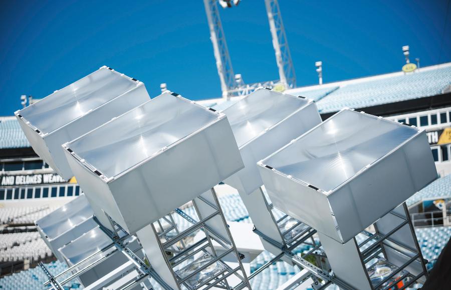 Zacznijmy od wizyty na stadionie futbolu amerykańskiego w Jacksonville na Florydzie. W marcu 2025 r., gdy jego trybuny stały puste, a w pobliżu kręcili się jedynie nieliczni pracownicy obsługi, inżynierowie start-upu Star Catcher wspięli się po drabinach, aby odsłonić rząd wysokich soczewek Fresnela ustawionych wzdłuż linii końcowej boiska – pierwszy realny krok w kierunku przesyłania energii słonecznej prosto z orbity. Każda soczewka miała ok. 1,2 m wysokości i była zamocowana na metalowym statywie. Andrew Rush, założyciel i dyrektor generalny Star Catcher, powoli przechadzał się między nimi, kontrolując na tablecie odczyty inklinometru – instrumentu do pomiaru kątów nachylenia. Soczewki zostały ustawione z niemal perfekcyjną precyzją, aby skoncentrować promienie słoneczne na odbiorniku znajdującym się w odległości 105 m po drugiej stronie boiska.