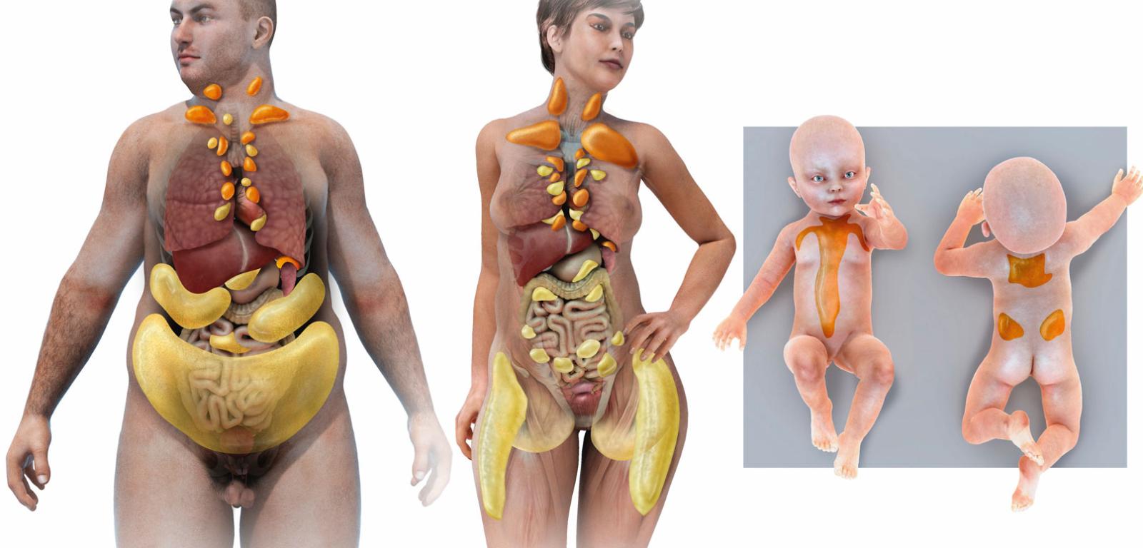 W organizmie tkanka tłuszczowa występuje głównie pod skórą (tzw. tłuszcz podskórny) i wewnątrz ciała (tzw. tłuszcz trzewny). Główną rolą tej pierwszej jest termoizolacja, natomiast druga stabilizuje narządy wewnętrzne. Co ciekawe, metabolicznie te dwa rodzaje tłuszczu znacznie się różnią. Szczególnie niebezpieczne jest zbyt duże nagromadzenie tłuszczu trzewnego, który odkładając się wokół narządów, zaburza ich prawidłowe funkcjonowanie, a dodatkowo często wydziela szkodliwe białka, mogące prowadzić do rozwoju chorób metabolicznych jak insulinooporność i cukrzyca.