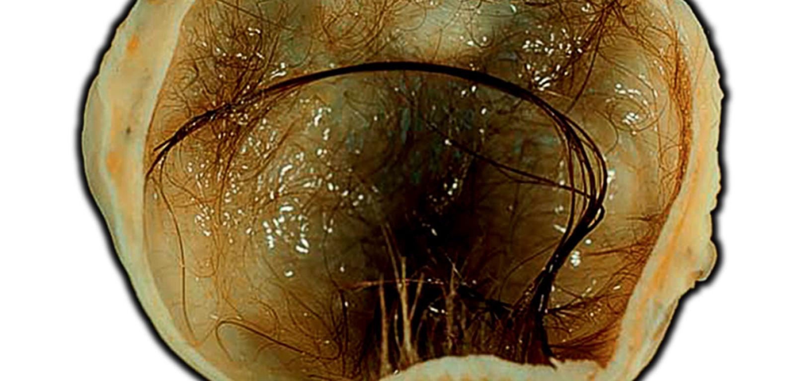 Nowotwór znaleziony przypadkiem podczas operacji wyrostka robaczkowego miał średnicę 10 cm. Gdy go przekrojono, okazało się, że zawiera miniaturowy mózg (impulsy elektryczne „przeskakiwały” z jednego neuronu na drugi), włosy i coś wyglądającego na cienką czaszkę. Wiadomo, że około 20% guzów jajnika zawiera obce tkanki, w tym włosy, zęby, chrząstki, tłuszcz czy mięśnie. Takie nowotwory są niezłośliwe, a nazywa się je potworniakami. Ekstremalnie rzadko komórki organizują się w uporządkowane struktury typu mózg.