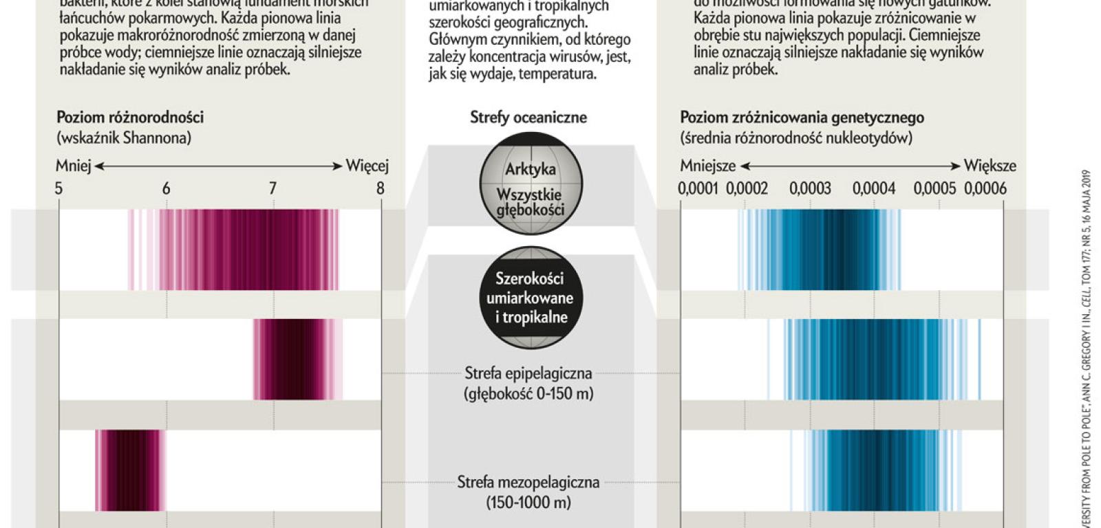 Choć naukowcy nie dysponują dokładnymi danymi na temat wirusów w oceanach, wielu z nich przyjmowało, że liczba tych organizmów spada w kierunku od równika ku biegunom. Nic z tych rzeczy. Z nowych badań, które znacznie rozszerzyły zbiór danych na temat oceanicznych wirusów, wynika, że Ocean Arktyczny jest w nie znacznie bogatszy niż pozostałe oceany. „To pod tym względem gorący region” – mówi jeden z autorów badań Matthew Sullivan, mikrobiolog z Ohio State University.
