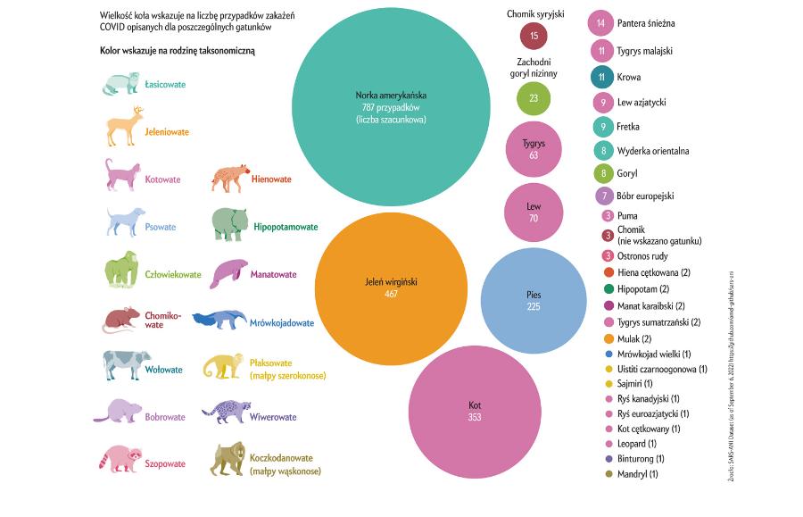 Covid-19 okazał się bardzo zakaźny dla wielu gatunków ssaków: infekcje szerzą się bez ograniczeń wśród hodowlanych norek, a aby je powstrzymać, hodowcy zwierząt futerkowych musieli zabijać cały swój inwentarz. Szczególnie wysoką podatność na wirusy wykazują jelenie. Zaraża się nimi także wiele gatunków kotów, tak dużych, jak i małych. Barbara Han, specjalistka ekologii chorób z Cary Institute of Ecosystem Studies w Millbrook w stanie Nowy Jork, która nie brała udziału w projekcie tworzenia bazy danych, uważa, że zgromadzenie tego rodzaju informacji w jednym miejscu – zamiast w licznych rozsianych źródłach, zarządzanych przez różne organizacje i agencje rządowe – prawdopodobnie sprawi, że jej zespół będzie mógł szybciej i łatwiej przewidywać zachowania wirusa.