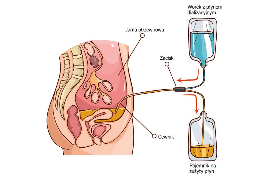 Przygotowanie pacjenta do procedury dializy otrzewnowej polega na chirurgicznym wykonaniu nacięcia w dolnej części jamy brzusznej, przez które lekarz wprowadza cewnik (obecnie głównie tzw. cewnik Tenckhoffa). Jest to oczywiście procedura jednorazowa, cewnik pozostaje w miejscu aż do zakończenia cyklu dializ. W następnym etapie jamę otrzewnej napełnia się płynem dializacyjnym, który został podgrzany do temperatury ciała. Dializa może być ręczna albo automatyczna. Wielką zaletą tej metody jest możliwość wykonywania jej w domu pacjenta, podczas snu chorego. Osoba dializowana prowadzi więc w dzień aktywne życie – chodzi do pracy czy szkoły, a także podróżuje, ponieważ zestawy do dializy łatwo przewieźć. Najwygodniejsza jest automatyczna dializa otrzewnowa (ADO). Aparat, zwany cyklerem, podłączamy samodzielnie wieczorem. Kontroluje on ilość podawanego płynu (podgrzewanie jest automatyczne), drenuje zużyty płyn i ponownie napełnia jamę otrzewnej kolejną jego porcją. Podłącza się go każdej nocy. Życie z dializą otrzewnową jest o wiele mniej skomplikowane niż w przypadku klasycznej hemodializy. Pacjent mieszka w domu i może pojechać w każde miejsce, gdzie tylko da się dostarczyć zestawy płynu dializacyjnego. W przypadku hemodializy trzeba się niestety za każdym razem udać do centrum dializ.