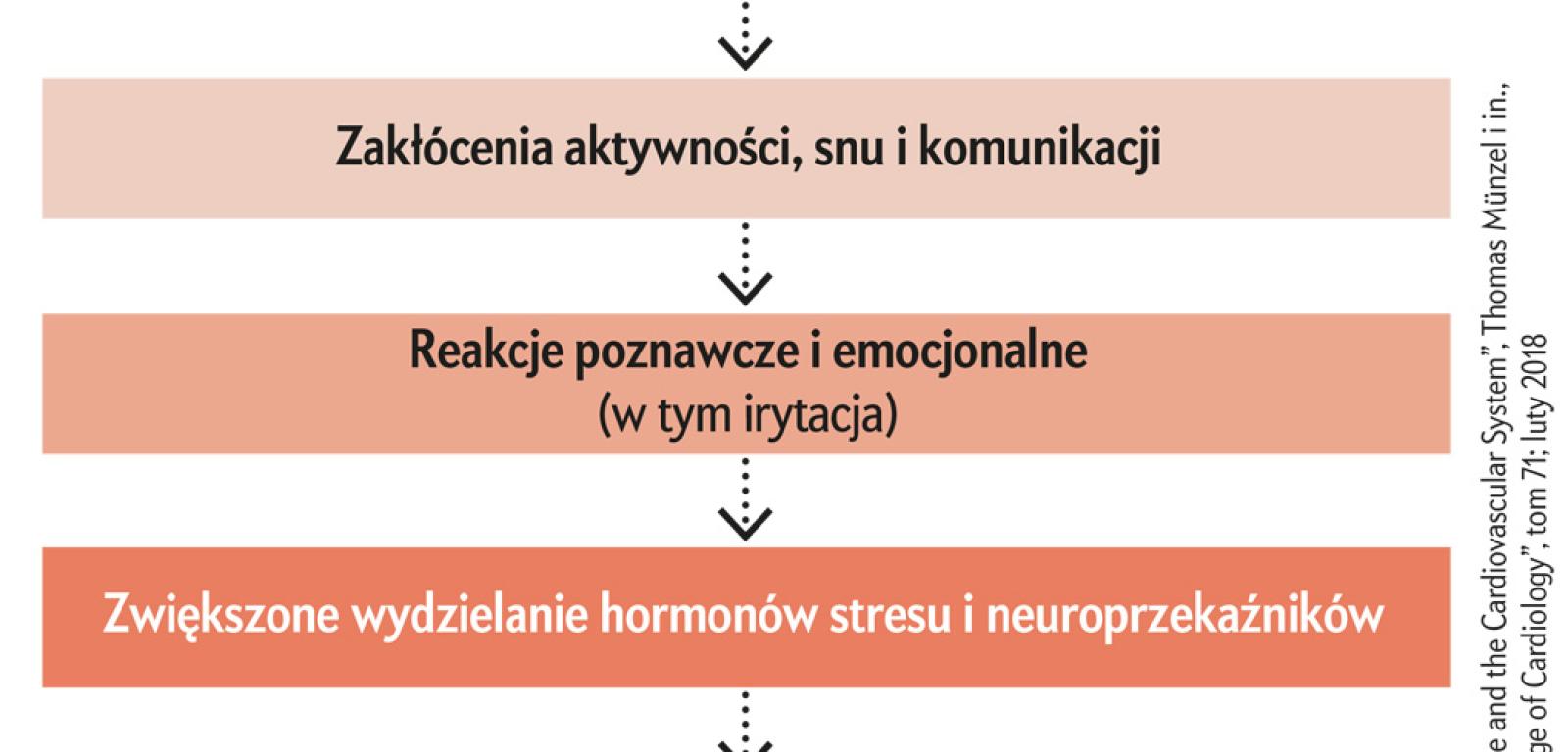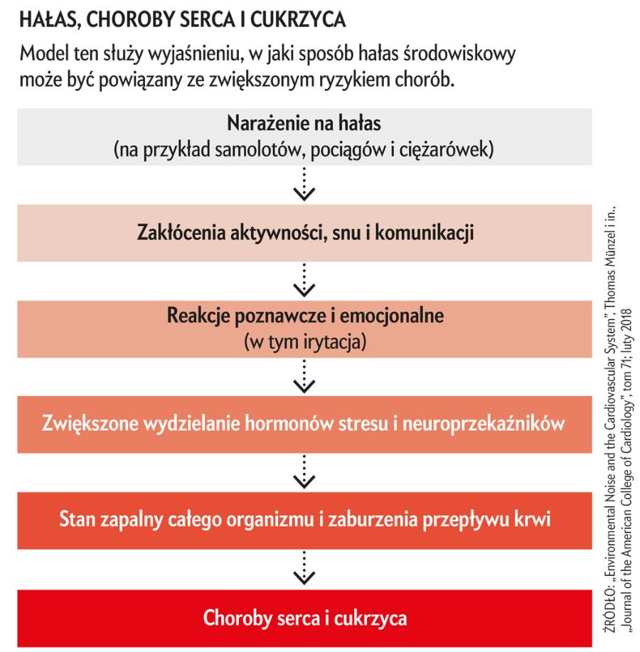 Hałas wpływa nie tylko na mózg i funkcje poznawcze, ale również na serce i naczynia krwionośne – co nie jest niczym zaskakującym, jeśli wziąć pod uwagę stresujące skutki hałasu oraz wpływ stresu na układ krążenia. Mnóstwo badań epidemiologicznych na przestrzeni lat powiązało hałas środowiskowy, zwłaszcza w nocy, z wysokim ciśnieniem krwi, niewydolnością serca, zawałem mięśnia sercowego i udarem mózgu. Związek ten utrzymywał się nawet po uwzględnieniu przez badaczy innych czynników, takich jak zanieczyszczenie powietrza i uwarunkowania społeczno-ekonomiczne.