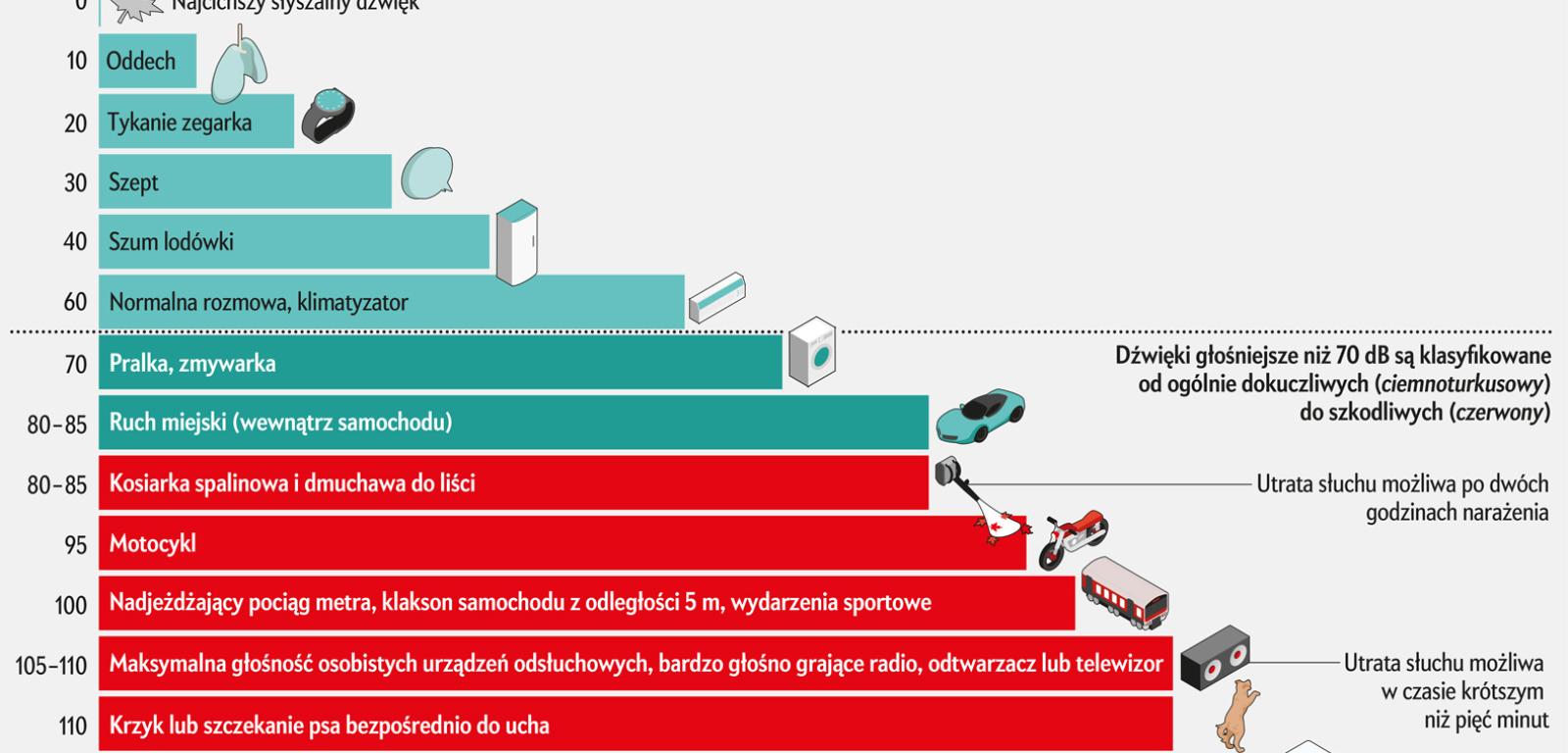 Jeśli chodzi o konkretne poziomy, do których należy dążyć, to bardzo trudno je określić. Nie ma wzoru, który mówi, że x godzin ekspozycji na hałas drogowy zwiększy ryzyko chorób serca o y procent. EPA, która ustanowiła swoje normy hałasu w 1974 roku, zanim skutki zdrowotne stały się w pełni znane, wskazuje, że aby nie doszło do uszkodzenia słuchu 24-godzinny poziom natężenia dźwięku, na jaki jesteśmy narażeni w ciagu doby, nie może przekroczyć 70 dB, aby nie doszło do zaburzeń zachowania i poirytowania nie powinien przekroczyć 55 dB na zewnątrz i 45 dB w pomieszczeniach. Wobec braku aktualniejszych są to