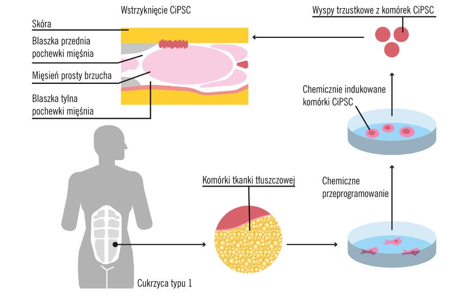 W ramach przeprowadzonych badań pobrano od 25-letniej pacjentki komórki tkanki tłuszczowej, które następnie przeprogramowano, czyli cofnięto do stanu komórki macierzystej. Za odkrycie tej metody Shinya Yamanaka został uhonorowany w 2012 r. Nagrodą Nobla. Tym razem naukowcy nieco zmodyfikowali opracowaną przez niego technikę – zamiast białek wykorzystali niewielkie związki chemiczne, co zwiększyło jej bezpieczeństwo. Z uzyskanych komórek macierzystych wytworzyli trójwymiarowe wysepki Langerhansa. W trakcie półgodzinnego zabiegu wstrzyknęli w mięśnie brzucha pacjentki aż 1,5 mln wysepek, co umożliwiło ich późniejszą obserwację za pomocą rezonansu magnetycznego. Eksperyment okazał się sukcesem. Już dwa i pół miesiąca później organizm wytwarzał wystarczającą ilość insuliny, co wyeliminowało konieczność podawania jej w formie zastrzyków. Taki stan utrzymuje się już od roku. Badacze będą dalej monitorować pacjentkę i planują zabiegi u kolejnych chorych, by potwierdzić skuteczność opracowanej metody.